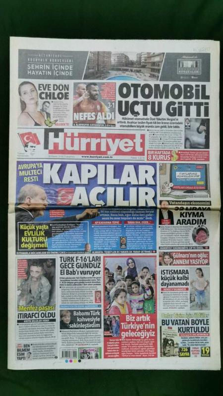 Hürriyet Gazete 26 Kasım 2016 Kapılar Açılır,Yasin Öztekin,Chloe Loughnan,Recep Tayyip Erdoğan,Angela Merkel,Pixee Fox,Kendall Jenner,Antonio Fernandez,Wesley Sneijder,Jan Olde Riekerink,Selçuk İnan,Martin Linnes,Galatasaray 3-1 Bursaspor,Vladimir Micov,Emir Preldzic,Blake Schlib,Tibor Pleiss,Alex Tyus,Ricardo Quaresma,Dick Advocaat,Hyun-Jun Suk,Vladimir Putin,Mesud Barzani,Rodrigo Londono,Cem Yılmaz,Behzat Gerçeker,Songül Öden,Ebru Gündeş,Murat Boz,Wilma Elles,İrem Sak,Erdal Beşikçioğlu,Gökçe Bahadır,Rojda Demirer,Toyota - Taşyapı - Vatan Computer - Vakko Reklamı,Seri İlanlar adlı eser, Kitap > Süreli Yayınlar > Gazeteler > Türkiye > Genel > Günlük kategorisinde İkinci El olarak satıştadır.