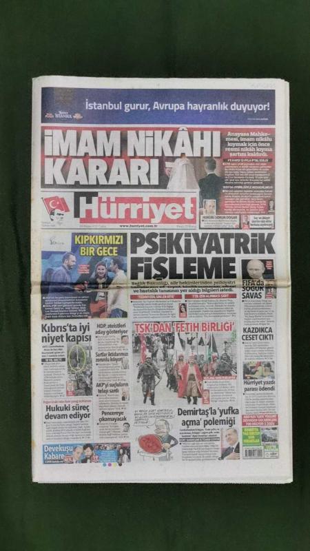 Kitap 2015 yılında yayınlanmıştır. 46 sayfadır. Hürriyet Gazete 29 Mayıs 2015 İmam Nikahı Kararı,Vladimir Putin,Vuslat Doğan Sabancı,Recep Tayyip Erdoğan,Ahmet Davutoğlu,Kemal Kılıçdaroğlu,Devlet Bahçeli,Selahattin Demirtaş,Felipe Melo,Yıldırım Demirören,Selçuk İnan,Caner Erkin,Kulüpler Birliği Toplantısı,Fatih Terim,Sepp Blatter,Süleyman Hurma - İbrahim Hacıosmanoğlu,Ali Kantur,Erhan Boysanoğlu,Süleyman Çetinsaya,Mesut Arslan,Ece Sükan,Ajda Pekkan,Şükran Ovalı,Burak Özçivit,İbrahim Tatlıses,Tur İlanları,Seri İlanlar,MHP - ETS Tur - Viaport Marina Reklamı adlı eser Türkçe dilindedir.