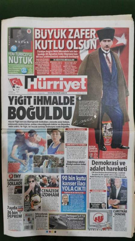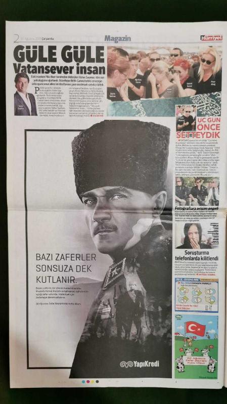 Kitap 2017 yılında yayınlanmıştır. 36 sayfadır. Hürriyet Gazete 30 Ağustos 2017 Büyük Zafer Kutlu Olsun,Güle Güle Vatansever İnsan,Cenazede İzdiham,Vatan Şaşmaz,Zeyno Günenç,Alp Eren Kamis,Melek Şahin,Demet Tuncer,Pınar Altuğ,Ferdi Akarnur,Tamer Karadağlı,Filiz Aker,Safiye Saydam,Burcu Esmersoy,Fatih Akın,'Kürk Mantolu Madanno' Sahneye Çıkıyor,Tuba Ünsal,Selanik'te Atatürk Rekoru,Bonservisini Al Öyle Gel,Jose Sosa,Tolgay Arslan,Fikret Orman,İşte Van Persie Gerçeği,Robin Van Persie,Luis Neto,9 Puana 38 Bin Kombine,Serdar Taşçı,Emre Mor,Kylian Mbappe,Arda Turan,Şampiyon Olduğu Elbiseyle Döndü,Rus Tenisçi Maria Sharapova,En Büyük Rakibimiz Bayram Tatili,Cedi Osman,Barış Hersek,Ali Muhammed,Sinan Güler,Doğuş Balbay,Erkan Veyseloğlu,Semih Erden,Furkan Aldemir,Kenan Sipahi,Göksenin Köksal,Melih Mahmutoğlu,Sertaç Şanlı,Furkan Korkmaz,Ufuk Sarıca,Sadece Aptallar Fikir Değiştirmaz,Mircea Lucescu,Oğuzhan Özyakup,Andriy Shevchenko,Yapı Kredi-İstanbul Arel Ü.-Turkcell-İstanbul Kültür Ü.-İstanbul Aydın Ü.-Atılım Ü. Bayram İlanları,Seri İlanlar adlı eser Türkçe dilindedir.