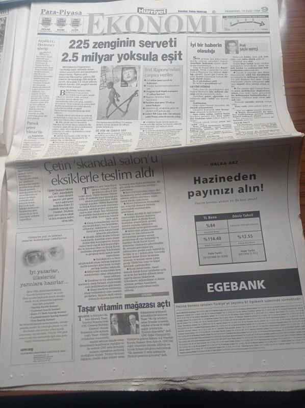 Hürriyet Gazetesi - 10 Eylül 1998 - Cumhuriyetimizin Ve Federasyonun 75. Yıl Kutlaması Organizasyonu Fiyaskoyla Sonuçlandı - Büyük Kupa Efes Pilsen'in - Maliye Bakanı Zekeriya Temizel - Tıpta En Son Mucize İsteyen Kız İsteyen Erkek Çocuk Sahibi Olabilecek - ABD S 300'ler Bölgeyi Rus Kontrolüne Sokar - Eşi Hülya Avşar'ı Aldattı İddiası - İstanbul Büyükşehir Belediye Başkanı Recep Tayyip Erdoğan Vali'yi Dava Etti adlı eser Türkçe dilindedir.