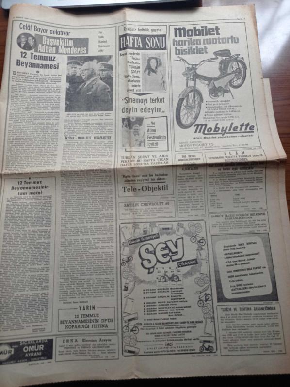 Hürriyet Gazetesi - 12 Temmuz 1969 - Celal Bayar Anlatıyor Başvekilim Adnan Menderes Yazı Dizisi - Saksonyalılar - Hafta Sonu Gazetesi Ses Birincisi Zeki Çetin - Kent Ve Site Sinemalarının 1969 1970 Dev Film Listesi - Sütlü Arı Mama - Öz Malınız Pop İkramiyelidir - Türkan Şoray - Mobilet Marka Harika Motorlu Bisiklet adlı eser Türkçe dilindedir.