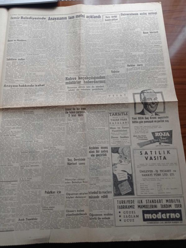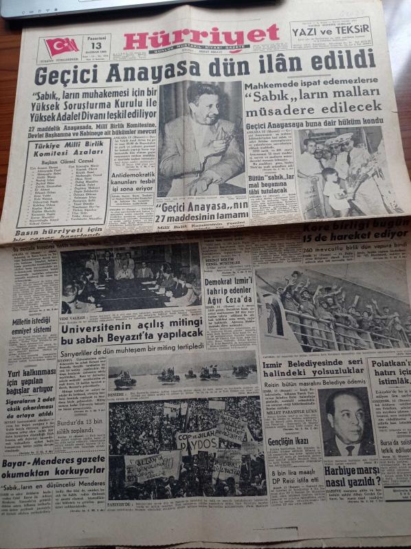 Hürriyet Gazetesi - 13 Haziran 1960 - Cemal Gürsel Kupası - 19 Mayıs Stadındaki İlk Gece Maçını Gençlerbirliği Bugün America İle Yapıyor - Fenerbahçe Beşiktaş'ı Yendi - Geçici Anayasa Dün İlan Edildi - Harbiye Marşı Nasıl Yazıldı - Hasan Polatkan'ın Hatırı İçin İstimlak - Türkiye Milli Birlik Komitesi Azaları - Cemal Gürsel - Alparslan Türkeş - Cemal Madanoğlu - Kore Birliği Bugün 15 de Hareket Ediyor - Sabık'ların Malları Müsadere Edilecek adlı eser Türkçe dilindedir.
