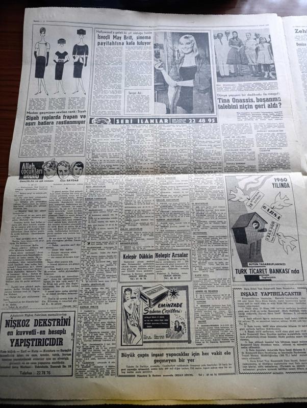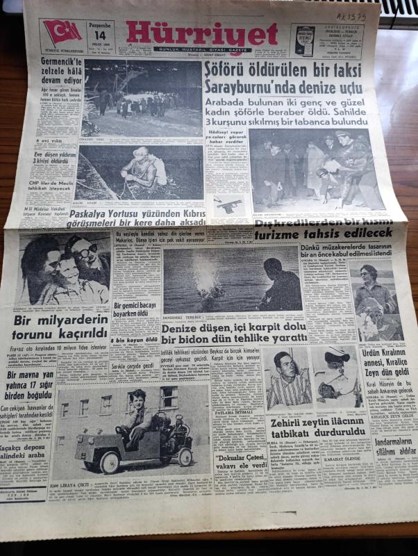 Hürriyet Gazetesi - 14 Nisan 1960 - Şoförü Öldürülen Bir Taksi Sarayburnu'nda Denize Uçtu - Germencik'te Zelzele Hala Devam Ediyor - Paskalya Yortusu Yüzünden Kıbrıs Görüşmeleri Bir Kere Daha Aksadı - Dış Kredilerden Bir Kısmı Turizme Tahsis Edilecek - Ürdün Kralının Annesi Kraliçe Zeyn Dün Geldi - Sarıkla Çarşıda Gezdi - Şahane Kadın Sevim Çağlayan Her Akşam Kazablanka'da - İsimsiz Kadın Aşk Ve His Romanı Yazan Theresa Drake Yazı Dizisi - Kuşlar Yollarını Nasıl Buluyorlar - Anten Reklam Takdim Eder Orhan Boran Ve Yuki - Dedektif Nik'in Maceraları Çizgi Roman - Galatasaray Fenerbahçe'yi 2 1 Yendi - Beşiktaş Milli Ligde Şampiyonluğu Garantiledi - Kalp Aldanmaz Aşk Ve His Romanı Çizen Faruk Geç - Galatasaray'ın Birinci Golü Fotoğraf - Allah Çocukları Unuttu Yazan Oya Baydar - İsveçli May Britt Sineması Payitahtına Kafa Tutuyor - Tina Onassis Boşanma Talebini Niçin Geri Aldı - Fenerbahçe Galatasaray Maçından Fotoğraflar - Fatoş Çizgi Roman - Güngörmüşler Çizgi Roman - Gökler Hakimi adlı eser, Kitap > Süreli Yayınlar > Gazeteler > Türkiye > Genel > Günlük kategorisinde İkinci El olarak satıştadır.