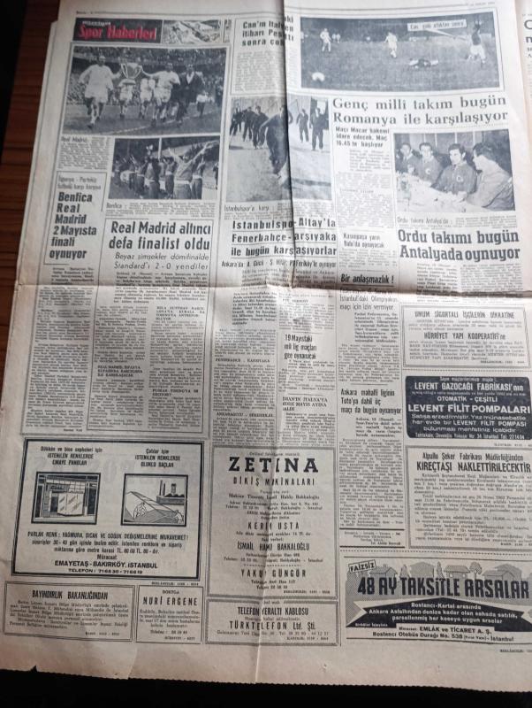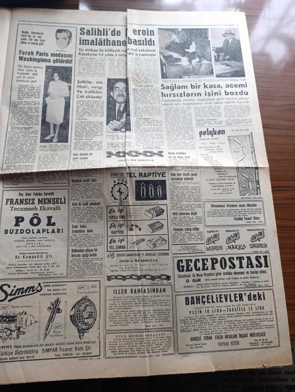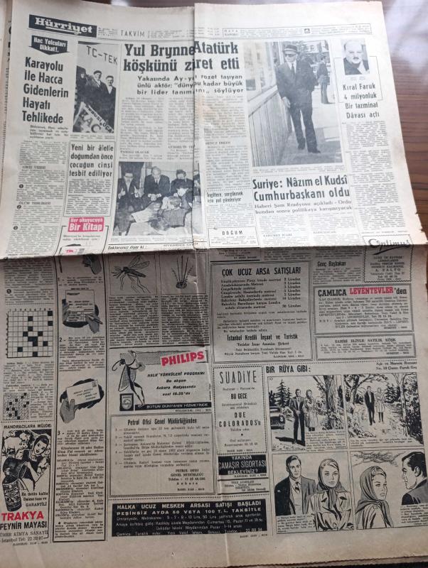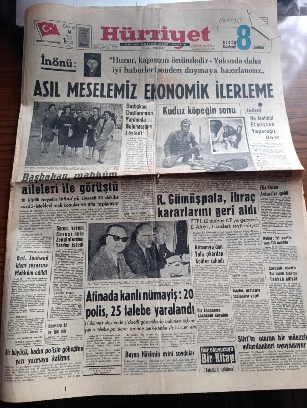 Hürriyet Gazetesi - 14 Nisan 1962 - İsmet İnönü huzur kapımızın önündedir asıl meselemiz ekonomik ilerleme dedi - ünlü rejisör Elia Kazan Ankara'ya geldi - Başbakan İsmet İnönü mahkum aileleri ile görüştü fotoğraf - Ragıp Gümüşpala ihraç kararlarını geri aldı - işçiler protesto toplantısı yaptı - Atina'da kanlı nümayiş 20 polis 25 talebe yaralandı - General Jouhaud idam cezasına mahkum edildi - burç falı - Abdülmecit'e ait çifte 5 bin liraya satıldı - Yul Brynner Atatürk köşkünü ziyaret etti - Suriye'de Nazım El Kudsi cumhurbaşkanı oldu - yeni bir aletle çocuğun cinsiyeti doğumdan önce belli oluyor - Real Madrid altıncı defa finalist oldu - Real Madrid Benfica finali fotoğraf - Fenerbahçe Karşıyaka maçı - Can Bartu'nun italya'daki itibarı Peşte'den sonra çok arttı - Ordu takımı Bugün Antalya'da oynuyor - kör bir köpek âmâ adama tam üç sene rehberlik etti - Burgiba ve yeni karısı fotoğraf - Avusturyalı 69 Profesör Dün İstanbul'a geldi - Fatoş karikatür - güngörmüşler karikatür adlı eser, Kitap > Süreli Yayınlar > Gazeteler > Türkiye > Genel > Günlük kategorisinde İkinci El olarak satıştadır.