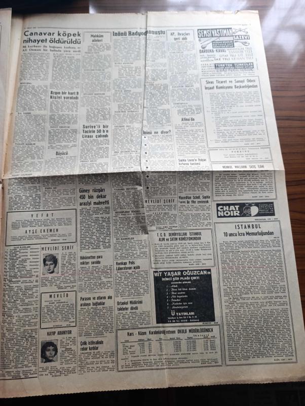 Hürriyet Gazetesi - 14 Nisan 1962 - İsmet İnönü huzur kapımızın önündedir asıl meselemiz ekonomik ilerleme dedi - ünlü rejisör Elia Kazan Ankara'ya geldi - Başbakan İsmet İnönü mahkum aileleri ile görüştü fotoğraf - Ragıp Gümüşpala ihraç kararlarını geri aldı - işçiler protesto toplantısı yaptı - Atina'da kanlı nümayiş 20 polis 25 talebe yaralandı - General Jouhaud idam cezasına mahkum edildi - burç falı - Abdülmecit'e ait çifte 5 bin liraya satıldı - Yul Brynner Atatürk köşkünü ziyaret etti - Suriye'de Nazım El Kudsi cumhurbaşkanı oldu - yeni bir aletle çocuğun cinsiyeti doğumdan önce belli oluyor - Real Madrid altıncı defa finalist oldu - Real Madrid Benfica finali fotoğraf - Fenerbahçe Karşıyaka maçı - Can Bartu'nun italya'daki itibarı Peşte'den sonra çok arttı - Ordu takımı Bugün Antalya'da oynuyor - kör bir köpek âmâ adama tam üç sene rehberlik etti - Burgiba ve yeni karısı fotoğraf - Avusturyalı 69 Profesör Dün İstanbul'a geldi - Fatoş karikatür - güngörmüşler karikatür, Sedat Simavi tarafından kaleme alınmıştır. Hürriyet Gazetesi - 14 Nisan 1962 - İsmet İnönü huzur kapımızın önündedir asıl meselemiz ekonomik ilerleme dedi - ünlü rejisör Elia Kazan Ankara'ya geldi - Başbakan İsmet İnönü mahkum aileleri ile görüştü fotoğraf - Ragıp Gümüşpala ihraç kararlarını geri aldı - işçiler protesto toplantısı yaptı - Atina'da kanlı nümayiş 20 polis 25 talebe yaralandı - General Jouhaud idam cezasına mahkum edildi - burç falı - Abdülmecit'e ait çifte 5 bin liraya satıldı - Yul Brynner Atatürk köşkünü ziyaret etti - Suriye'de Nazım El Kudsi cumhurbaşkanı oldu - yeni bir aletle çocuğun cinsiyeti doğumdan önce belli oluyor - Real Madrid altıncı defa finalist oldu - Real Madrid Benfica finali fotoğraf - Fenerbahçe Karşıyaka maçı - Can Bartu'nun italya'daki itibarı Peşte'den sonra çok arttı - Ordu takımı Bugün Antalya'da oynuyor - kör bir köpek âmâ adama tam üç sene rehberlik etti - Burgiba ve yeni karısı fotoğraf - Avusturyalı 69 Profesör Dün İstanbul'a geldi - Fatoş karikatür - güngörmüşler karikatür adlı eser Türkçe dilindedir.