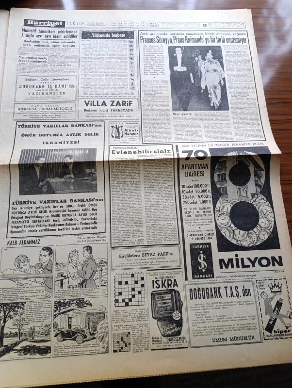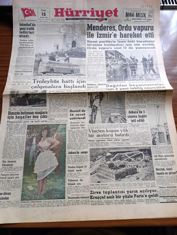Hürriyet Gazetesi - 15 Mayıs 1960 - Adnan Menderes Ordu Vapuru İle İzmir'e Hareket Etti - İstanbul'da Yeni Bir Trafik Tedbirleri Alındı - Troleybüs Hattı İçin Çalışmalara Başlandı - Lübnan Hükümeti İstifa Etti - Osman Bölükbaşı İsmet İnönü'yü Ziyaret Etti - Hınıs'ta Bulunan Mağara için Hayaller Boş Çıktı - Ankara'da Sinema Bugün Tatil Edildi - Ali Han Şatosuna Gömülecek - İsimsiz Kadın Aşk Ve His Romanı Yazan Theresa Drake Yazı Dizisi - Çırağan Tesisleri İnşaatı Yaz Sonunda Başlayacak - Dedektif Nik'in Maceraları Çizgi Roman - Kalp Aldanmaz Aşk Ve Macera Romanı Çizen Faruk Geç - Filmciler Ahlak Kanunlarına Harp İlan Ettiler - Hürrem Sultan Yazan Feridun Fazıl Tülbentçi Yazı Dizisi - Allah Çocukları Unuttu Yazan Oya Baydar Yazı Dizisi - Türkiye Yunanistan Ordu Futbol Takımları Bugün 18 de Karşılaşıyor - Fatoş Çizgi Roman - Hacettepe 2 Adalet 0 - Dünya Ordulararası Futbol Şampiyonası - Fatoş Çizgi Roman - Güngörmüşler Çizgi Roman, Sedat Simavi tarafından kaleme alınmıştır. Hürriyet Gazetesi - 15 Mayıs 1960 - Adnan Menderes Ordu Vapuru İle İzmir'e Hareket Etti - İstanbul'da Yeni Bir Trafik Tedbirleri Alındı - Troleybüs Hattı İçin Çalışmalara Başlandı - Lübnan Hükümeti İstifa Etti - Osman Bölükbaşı İsmet İnönü'yü Ziyaret Etti - Hınıs'ta Bulunan Mağara için Hayaller Boş Çıktı - Ankara'da Sinema Bugün Tatil Edildi - Ali Han Şatosuna Gömülecek - İsimsiz Kadın Aşk Ve His Romanı Yazan Theresa Drake Yazı Dizisi - Çırağan Tesisleri İnşaatı Yaz Sonunda Başlayacak - Dedektif Nik'in Maceraları Çizgi Roman - Kalp Aldanmaz Aşk Ve Macera Romanı Çizen Faruk Geç - Filmciler Ahlak Kanunlarına Harp İlan Ettiler - Hürrem Sultan Yazan Feridun Fazıl Tülbentçi Yazı Dizisi - Allah Çocukları Unuttu Yazan Oya Baydar Yazı Dizisi - Türkiye Yunanistan Ordu Futbol Takımları Bugün 18 de Karşılaşıyor - Fatoş Çizgi Roman - Hacettepe 2 Adalet 0 - Dünya Ordulararası Futbol Şampiyonası - Fatoş Çizgi Roman - Güngörmüşler Çizgi Roman adlı eser Türkçe dilindedir.
