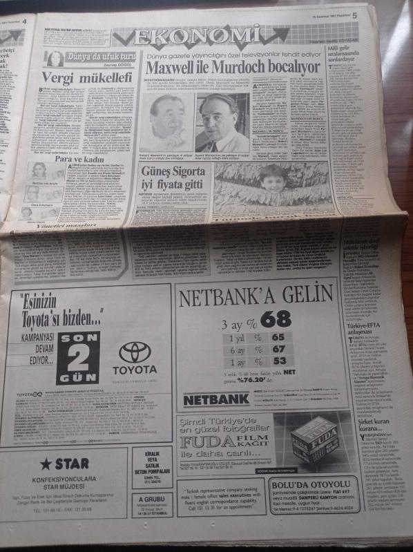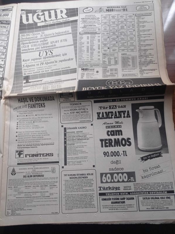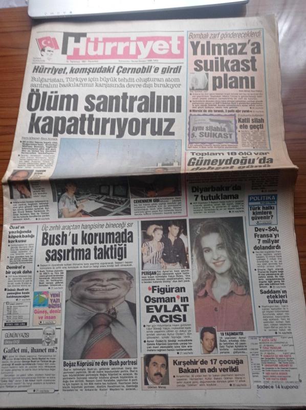 Hürriyet Gazetesi - 15 Temmuz 1991 - Hoşgeldin Galatasaray - Tanju Çolak - Mustafa Denizli - Mesut Yılmaz'a Suikast Planı - Dev Sol Fransa'yı 7 Milyar Dolandırdı - Bush'u Korumada Şaşırtmada Taktiği - Turgut Özal'ın Yazlığında Köpekbalığı Korkusu - Süleyman Demirel - Ölüm Santralini Kapattırıyoruz adlı eser Türkçe dilindedir.