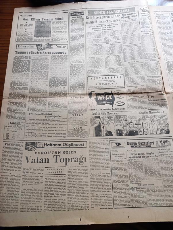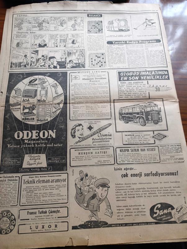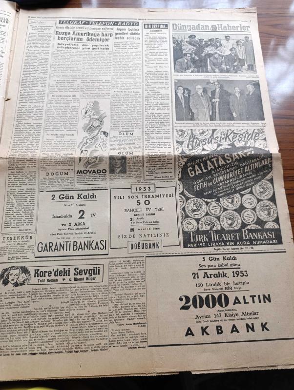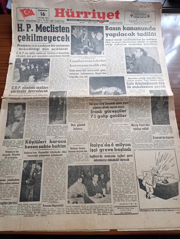 Hürriyet Gazetesi - 16 Aralık 1953 - Halk Partisi Meclisten Çekilmeyecek - Cumhuriyet Halk Partisi Elindeki Malları Pürüzsüz Devredecek - Cumhurreisi Celal Bayar İstirdat Kanununu Tasdik Etti - Basın Kanununda Yapılacak Tadilat - Yeni Sabah Gazetesi Sahibi Safa Kılıçlıoğlu Dünkü Duruşma Sırasında Fotoğraf - Necip Fazıl Kısakürek Dün Tahliye Edildi - Dün Gece Sergi Sarayında Gazoz Şişesi Yağmuru Altında Yapılan Maçta İranlı Güreşçiler 7 1 Galip Geldiler - İtalya'da 6 Milyon İşçi Greve Başladı - 16 Aralık 1909 Gazi Ethem Paşa'nın Ölümü - Rodos'tan Gelen Vatan Toprağı Yazan Nihad Sami Banarlı - Kore'deki Sevgili Yazan O. İlhami Bilger Yazı Dizisi - Dünyadan Haberler - Günümüzde Franco İspanyası - Hiç Bilmediğimiz Bir Alemin Sırları Hayvanlar Aleminde Aşk - Amerika'dan Kızıllara Karşı Savaş FBI Çağırıyor Yazı Dizisi - Bugün Fenerbahçe Beyoğluspor'la Karşılaşıyor - 2. Sultan Abdülhamit'in Sefir Avlama Sistemi Yazan Mehmet Reşit - Altın Kalpli Melek Kız Çizen Şevki adlı eser, Kitap > Süreli Yayınlar > Gazeteler > Türkiye > Genel > Günlük kategorisinde İkinci El olarak satıştadır.