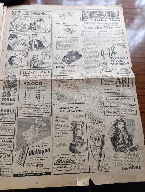 Hürriyet Gazetesi - 16 Aralık 1953 - Halk Partisi Meclisten Çekilmeyecek - Cumhuriyet Halk Partisi Elindeki Malları Pürüzsüz Devredecek - Cumhurreisi Celal Bayar İstirdat Kanununu Tasdik Etti - Basın Kanununda Yapılacak Tadilat - Yeni Sabah Gazetesi Sahibi Safa Kılıçlıoğlu Dünkü Duruşma Sırasında Fotoğraf - Necip Fazıl Kısakürek Dün Tahliye Edildi - Dün Gece Sergi Sarayında Gazoz Şişesi Yağmuru Altında Yapılan Maçta İranlı Güreşçiler 7 1 Galip Geldiler - İtalya'da 6 Milyon İşçi Greve Başladı - 16 Aralık 1909 Gazi Ethem Paşa'nın Ölümü - Rodos'tan Gelen Vatan Toprağı Yazan Nihad Sami Banarlı - Kore'deki Sevgili Yazan O. İlhami Bilger Yazı Dizisi - Dünyadan Haberler - Günümüzde Franco İspanyası - Hiç Bilmediğimiz Bir Alemin Sırları Hayvanlar Aleminde Aşk - Amerika'dan Kızıllara Karşı Savaş FBI Çağırıyor Yazı Dizisi - Bugün Fenerbahçe Beyoğluspor'la Karşılaşıyor - 2. Sultan Abdülhamit'in Sefir Avlama Sistemi Yazan Mehmet Reşit - Altın Kalpli Melek Kız Çizen Şevki, Sedat Simavi tarafından kaleme alınmıştır. Hürriyet Gazetesi - 16 Aralık 1953 - Halk Partisi Meclisten Çekilmeyecek - Cumhuriyet Halk Partisi Elindeki Malları Pürüzsüz Devredecek - Cumhurreisi Celal Bayar İstirdat Kanununu Tasdik Etti - Basın Kanununda Yapılacak Tadilat - Yeni Sabah Gazetesi Sahibi Safa Kılıçlıoğlu Dünkü Duruşma Sırasında Fotoğraf - Necip Fazıl Kısakürek Dün Tahliye Edildi - Dün Gece Sergi Sarayında Gazoz Şişesi Yağmuru Altında Yapılan Maçta İranlı Güreşçiler 7 1 Galip Geldiler - İtalya'da 6 Milyon İşçi Greve Başladı - 16 Aralık 1909 Gazi Ethem Paşa'nın Ölümü - Rodos'tan Gelen Vatan Toprağı Yazan Nihad Sami Banarlı - Kore'deki Sevgili Yazan O. İlhami Bilger Yazı Dizisi - Dünyadan Haberler - Günümüzde Franco İspanyası - Hiç Bilmediğimiz Bir Alemin Sırları Hayvanlar Aleminde Aşk - Amerika'dan Kızıllara Karşı Savaş FBI Çağırıyor Yazı Dizisi - Bugün Fenerbahçe Beyoğluspor'la Karşılaşıyor - 2. Sultan Abdülhamit'in Sefir Avlama Sistemi Yazan Mehmet Reşit - Altın Kalpli Melek Kız Çizen Şevki adlı eser Türkçe dilindedir.