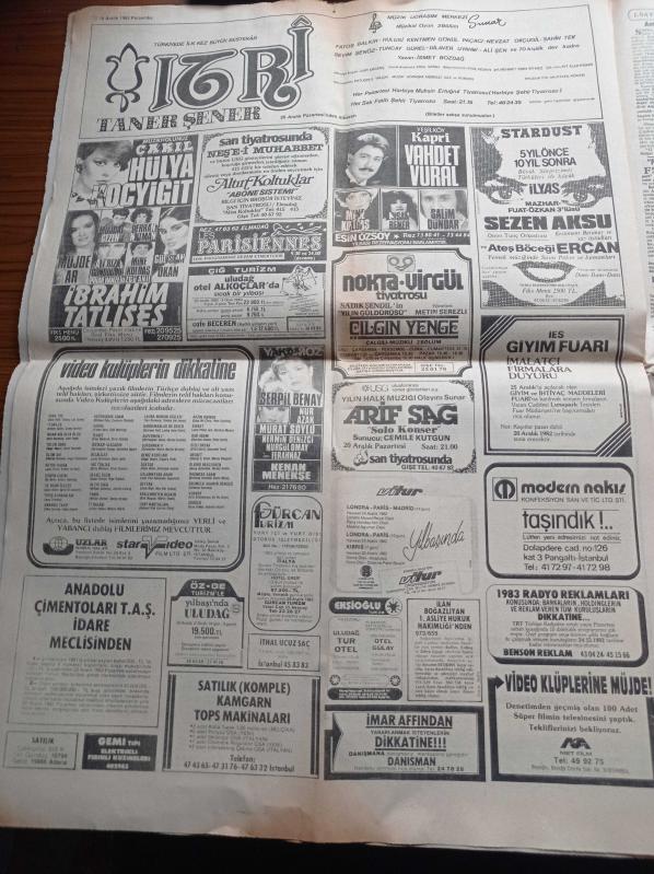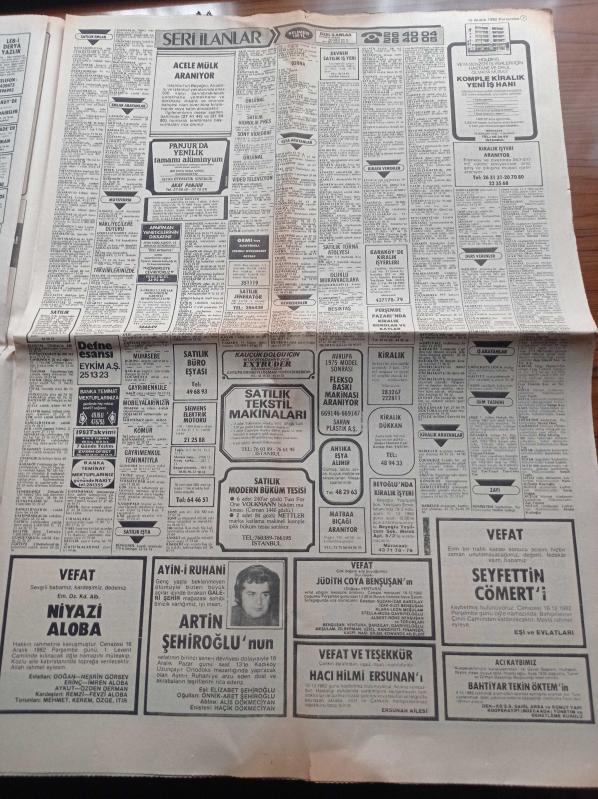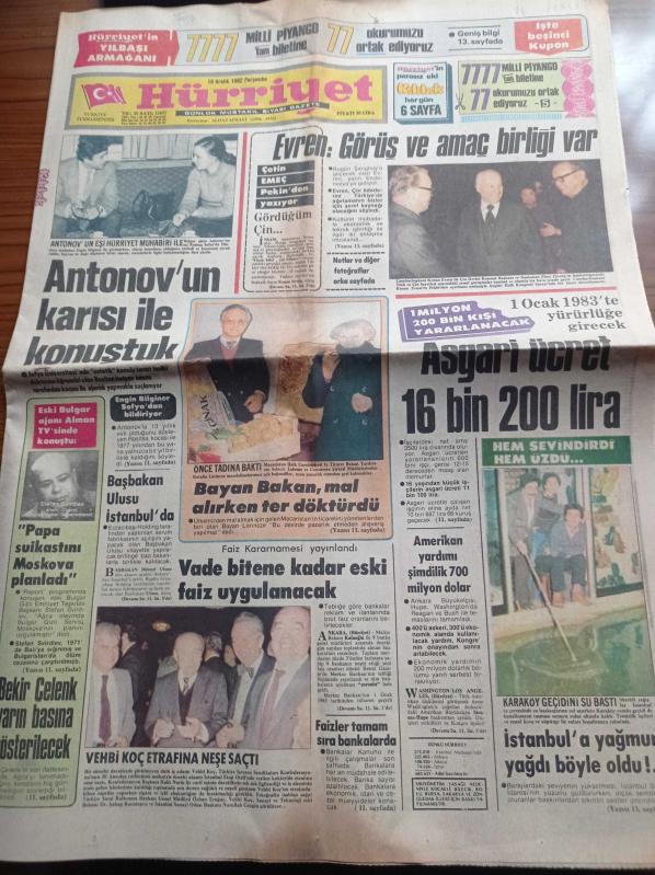 Hürriyet Gazetesi - 16 Aralık 1982 - Arif Sağ - Hülya Koçyiğit - Müjde Ar - Perran Kutman - Müjdat Gezen - Fenerbahçe Stankoviç'in Gözüne Vurdu - Ünlü Jokey Mümin Çılgın - Kenan Evren Bugün Şanghay'a Geçecek - Çetin Emeç Pekin'den Yazıyor - Eski Bulgar Ajanı Alman Tv'sine Konuştu Papa Suikastını Moskova Planladı - Bulgar Ajanı Antonov - Başbakan Bülent Ulusu adlı eser Türkçe dilindedir.