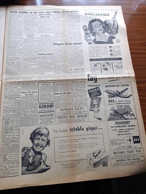 Hürriyet Gazetesi - 16 Temmuz 1957 - İngiltere Kıbrıs Konusunda Taksimi Son Çare Görüyor - İstanbul Sıcaktan Kavrulurken Ankara Adana Ve Konya'da Seller Zarar Yaptı - Beyoğlu Ve Anadolu Yakasında İki Büyük İşçi Hastanesi Kurulacak - Gökay'ı Sevenler Cemiyet Kuruyor - Long Beach'te Güzellere Pek Rağbet Yok - İkimizin Erkeği Aşk Romanı Yazan Vicki Baum Yazı Dizisi - Su Sporları Sitesi Yazan Abdurrahman Benlioğlu - Dedektif Nik'in Maceraları Çizgi Roman - Asya Gribi Suriye Hicaz Lübnan Ve İsrail'de Süratle Yayılıyor - Siyah Kuğu Aşk Ve Macera Romanı Çizen Faruk Geç - Spor Ve Sergi Sarayı 12 Milyon Liraya Satılıyor - Kıbrıs'ın Fethi Yazan Nizameddin Nazif Tepedelenlioğlu Yazı Dizisi - 40 Yıl Kanunsuz Yaşadım Yazan Blackie Audet Yazı Dizisi - Fenerbahçe Eski Macar Antrenörü Molnar Dün Gece Geldi - Önümüzdeki Mevsim Galatasaray İçin İki Antrenör Namzedi George Dick ve Sandro Puppo - Beşiktaş İsveç'teki İlk Maçını Bugün Oynuyor - Fatoş Çizgi Roman - Güngörmüşler Çizgi Roman - Gökler Hakimi adlı eser, Kitap > Süreli Yayınlar > Gazeteler > Türkiye > Genel > Günlük kategorisinde İkinci El olarak satıştadır.
