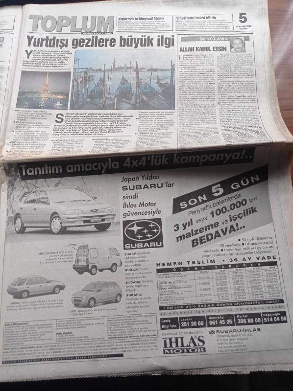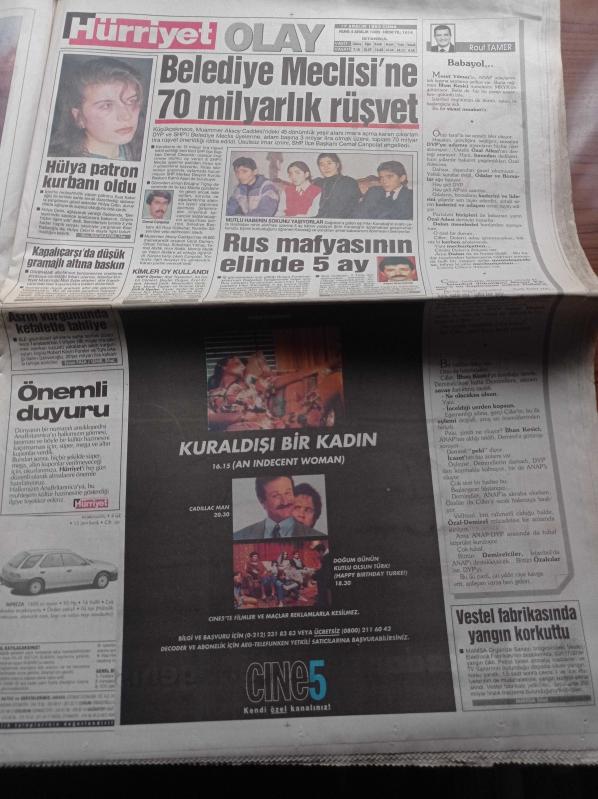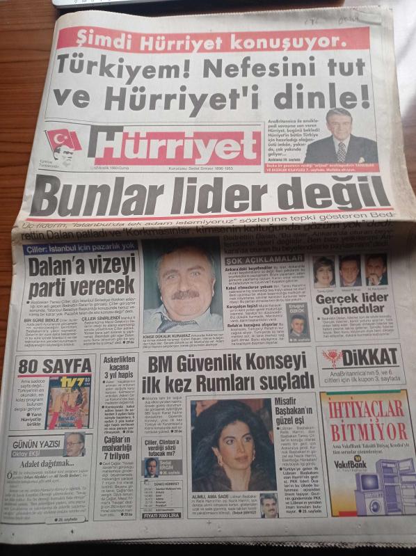 Hürriyet Gazetesi - 17 Aralık 1993 - Fenerbahçe Harun Erdenay NBA Yıldızı Gibi - Takma Efes Pilsen - Mahsun Kırmızıgül'e İbrahim Tatlıses'ten Öğütler - Bülent Ersoy - Tansu Çiller İstanbul İçin Pazarlık Yok - Bedrettin Dalan'a Vizeyi Parti Verecek - Cavit Çağlar'ın Malvarlığı 7 Trilyon - Bedrettin Dalan Patladı - Tansu - Mesut Yılmaz - Murat Karayalçın adlı eser, Kitap > Süreli Yayınlar > Gazeteler kategorisinde İkinci El olarak satıştadır.