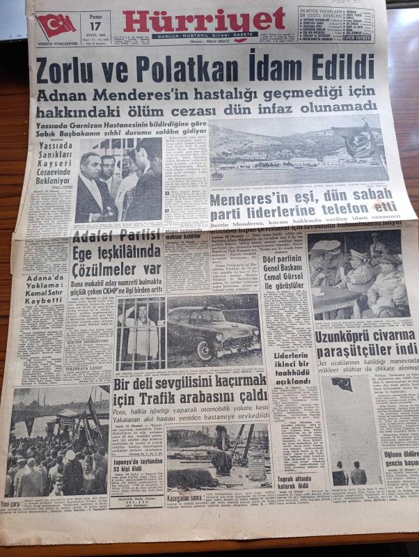 Hürriyet Gazetesi - 17 Eylül 1961 - Fatin Rüştü Zorlu Ve Hasan Polatkan İdam Edildi - Adnan Menderes'in Hastalığı Geçmediği İçin Hakkındaki Ölüm Cezası Dün İnfaz Olunamadı - Yassıada Sanıkları Kayseri Cezaevinde Bekleniyor - Adana'da Yoklama Kemal Satır Kaybetti - Adnan Menderes'in Eşi Berrin Menderes Dün Sabah Parti Liderlerine Telefon Etti - Adalet Partisi Ege Teşkilatında Çözülmeler Var - Dört Parti'nin Genel Başkanı Cemal Gürsel İle Görüştüler - Yol Orada Aşk Romanı Yazan A.S. Turnboll - Dedektif Nik'in Maceraları Çizgi Roman - Bazı İlkokullar Bu Yıl Da Barakada Çalışıyor - ÇBS Boya - Alsancak Stadındaki Maçta Galatasaray 1 Göztepe 1 - Fenerbahçe Ankaragücü'nü Dünkü Maçta 2 1 Yendi - Metin Oktay'lı Palermo Bugün Catania İle Oynuyor - Lefter Küçükandonyadis - Fatoş Çizgi Roman - Güngörmüşler Çizgi Roman - Toto Maçında Hacettepe Galip - Beşiktaş'ın Beraberlikle Golü Fotoğraf adlı eser, Kitap > Süreli Yayınlar > Gazeteler > Türkiye > Genel > Günlük kategorisinde İkinci El olarak satıştadır.