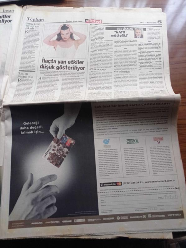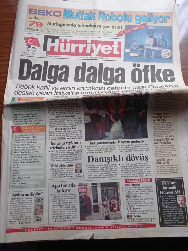 Hürriyet Gazetesi - 17 Kasım 1998 - Bebek Katili Eroin Kaçakçısı Abdullah Öcalan'a Sahip Çıkan İtalya'ya Tepki Büyüyor - İtalya'ya Boykot - Sergen Yalçın'ın Hukuk Savaşı - Alpay Özalan Hakeme Ağır Ceza Verilmeli - Barbie Faciası - Ted Turner'in Gözü Beyaz Sarayda - Kahraman Cindy Crawford - Mesut Yılmaz İdamı Kaldırıp Abdullah Öcalan'ı Getirteceğiz - Apo İçin Mehmet Ali Ağca Modeli Müebbet Hapis - Apo Burada Kalıyor - Türkiye'de İş Yapan İtalyan Şirketleri adlı eser Türkçe dilindedir.
