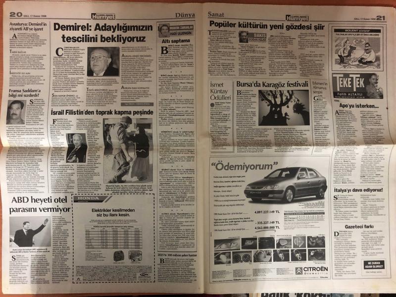 Hürriyet Gazetesi - 17 Kasım 1998 Bero - - İtalya - Almanya - Yabancı yatırım - AP - Doğuş - Tofaş - Redd - Eder - Özel Sektör - Rahmi Koç - Hollanda - İngiltere - Fransa - Belçika - Model - Güvenlik önlemleri - DYP - Hikmet Çetin - Eren - Galatasaray - Orman - Yaban hayatı - Brezilya - Rota - Avusturya - Trabzonspor - Ukrayna - Fenerbahçe - Teknik Direktör - Taffarel - Edis - Onur - Gol Krallığı - Bitki örtüsü - Beşiktaş - İspanya - Portekiz - Mario - Alpay - LP - Anayasa Mahkemesi - Sinan - AK Parti - Ege - Simge - Aydın Doğan - Ertuğrul Özkök - Tansu Çiller - Basın Toplantısı - Süleyman Demirel - Alaattin Çakıcı - Cengiz - ANAP - Mesut Yılmaz - Göksel - Yilmaz - Nez - Rusya - Danimarka - Yunanistan - Ermenistan - MHP - Agu - Beta adlı eser Türkçe dilindedir.
