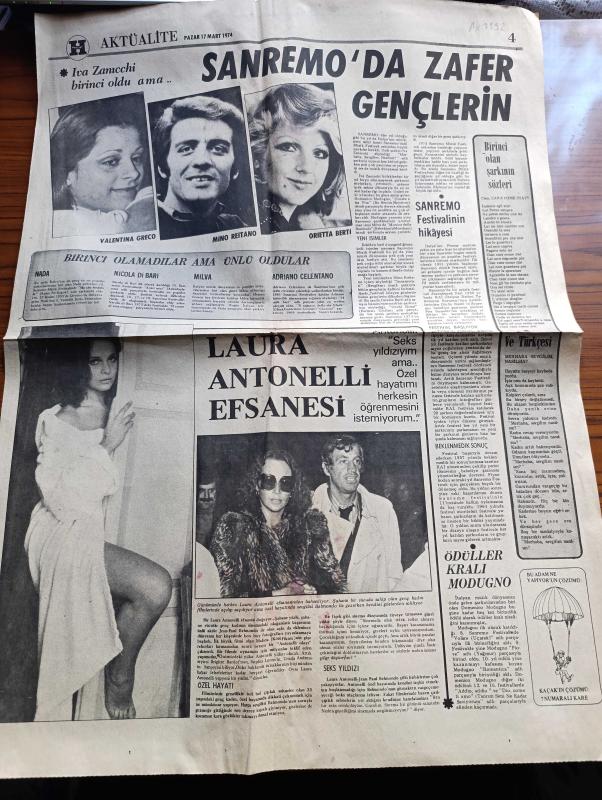 Hürriyet Gazetesi - 17 Mart 1974 - Iva Zanıcchi Birinci Oldu San Remo'da Zafer Gençlerin - Sanremo Müzik Festivali - Sanremo Festivalinin Hikayesi - Valentino Greco Fotoğraf - Mino Reitano Fotoğraf - Orietta Berti Fotoğraf - Laura Antonelli Seks Yıldızıyım Ama Özel Hayatımı Herkesin Öğrenmesini İstemiyorum Fotoğraf - Ödüller Kralı Modugno - Sanremo Festivalinde Birinci Olan Şarkının İtalyanca Ve Türkçe Sözleri - Eskitemediğimiz Şöhretler - Cem Karaca Fotoğraf - Barış Manço Fotoğraf - Ajda Pekkan Fotoğraf - Alpay Fotoğraf - Şenay Fotoğraf - Çemberi Yaranlar Edip Akbayram Nilüfer Ve Ersen Fotoğrafı - Ayten Alpman Fotoğraf - Salim Dündar Fotoğraf adlı eser, Kitap > Süreli Yayınlar > Gazeteler > Türkiye > Genel > Günlük kategorisinde İkinci El olarak satıştadır.