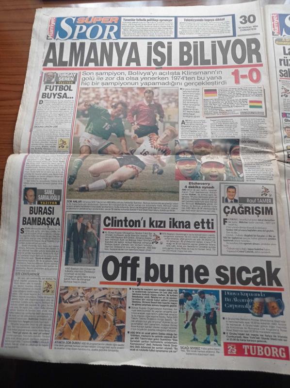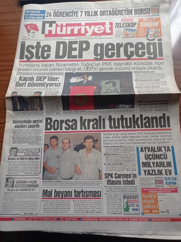 Hürriyet Gazetesi - 18 Haziran 1994 - 1994 ABD Dünya Kupası - Bill Clinton'ı Kızı İkna Etti - Berna Laçin - Muazzez Abacı - Recep Tayyip Erdoğan'dan Yollara Refah Partisi Yeşili - İşte DEP Gerçeği - Yurtdışına Kaçan Nizamettin Toguç'un PKK Bayraklı Kürsüde Apo Posteri Önünde Çekilen Fotoğrafı - Borsa Kralı Nasrullah Ayan Tutuklandı adlı eser, Kitap > Süreli Yayınlar > Gazeteler kategorisinde İkinci El olarak satıştadır.