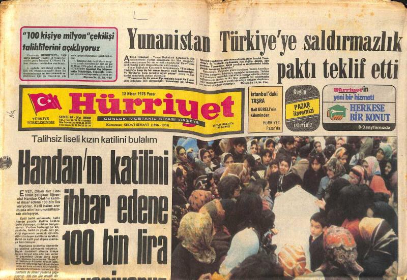 Hürriyet Gazetesi 18 Nisan 1976 - Handan'ın Katilini İhbar Edene 100 Bin Lira Veriyoruz - Yunanistan Türkiye'ye Saldırmazlık Paktı Teklif Etti GZ147045, en son 22 gün önce güncellenmiştir.