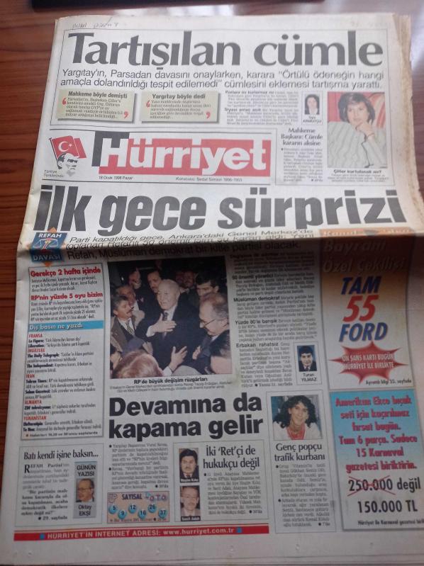 Hürriyet Gazetesi - 18 Ocak 1998 - Pascal Nouma Beşiktaş'a Geliyor - Süleyman Seba - Refah Partisi Kapatıldı Yaşasın Yeni Refah Partisi - Grup Vitamin'in Ünlü Üyesi Gökhan Semiz Trafik Kurbanı - Yargıtay Başsavcısı Vural Savaş Yeni Partiye de Kapama Gelir - Recep Tayyip Erdoğan - Necmettin Erbakan - Parsadan Davası - Tansu Çiller - Zeki Müren - Safiye Ayla adlı eser Türkçe dilindedir.