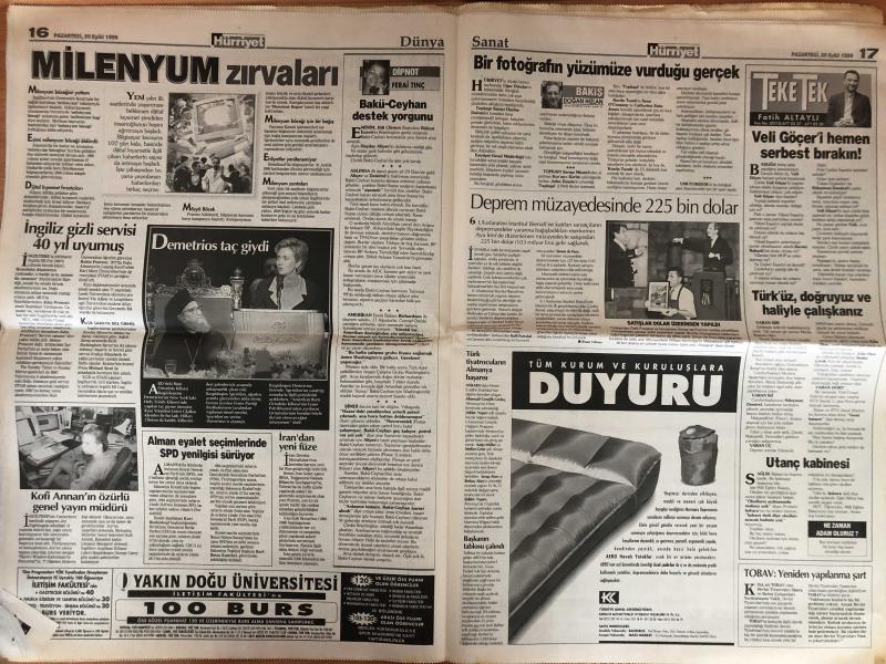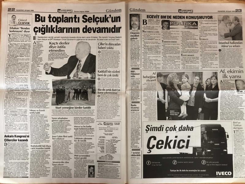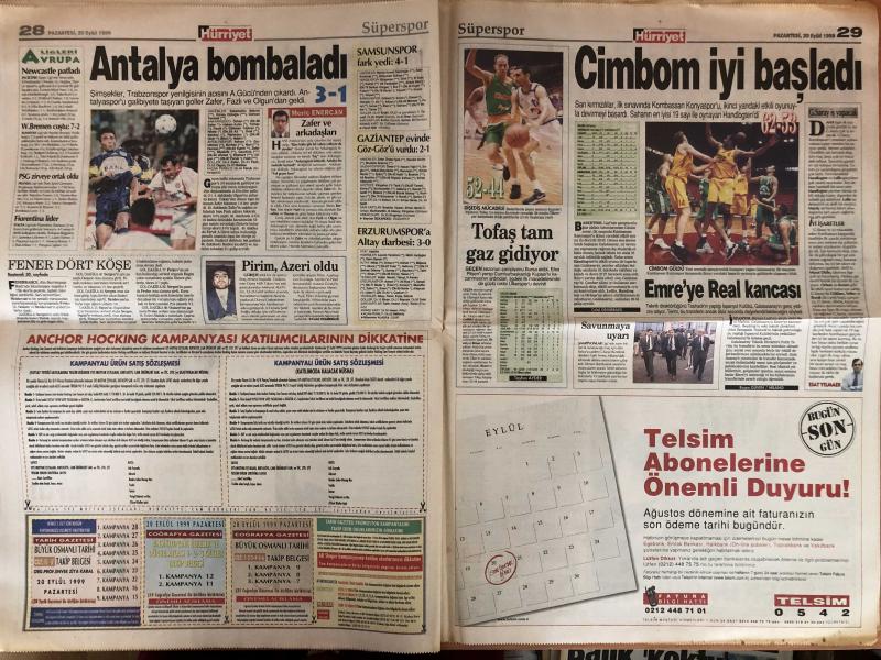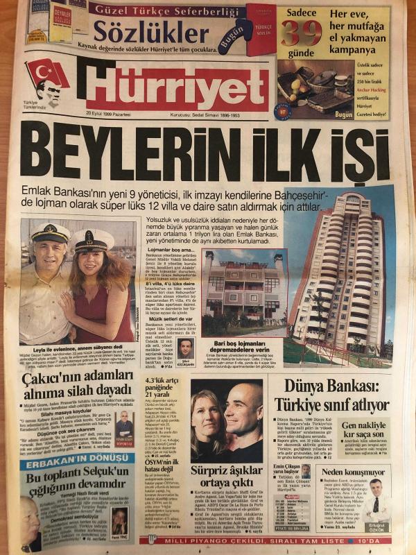 Hürriyet Gazetesi - 20 Eylül 1999 - - Müjdat Gezen - Adamlar - Sinan - Lyon - Zara - AP - Fransa - Baha - Alaattin Çakıcı - Suso - Selçuk - Nazlı Ilıcak - Çelik - Oscar - Andre Agassi - Steffi Graf - Eren - Emin Çölaşan - Ertugrul - Tayfun - Fenerbahçe - Hulk - Yasin - Teknik Direktör - Hakan Şükür - Macaristan - Seda Sayan - Moldova - Beşiktaş - Mahmut - Alpay - LP - Emre - Yeni Transfer - Eder - Puan Durumu - Şili - Yusuf - Cengiz - Ege - Hagi - Mesut Yılmaz - Redd - Sami Selçuk - Necmettin Erbakan - Belediyeler - Tansu Çiller - DYP - PAK - Bedük - Saffet Arıkan Bedük - AKP - Akif Gülle - Mehmet Ali Birand - Ali Bayramoğlu - Merve Kavakçı - Anayasa Değişikliği - İsviçre - AIK - BBP - Aydın Doğan - Ertuğrul Özkök - Tufan Türenç - Atiba - Bülent Ecevit - Hikmet Sami Türk - DSP - Nez - Turgut Özal - Orman - Yunanistan - Süleyman Demirel - Belçika - Rusya adlı eser Türkçe dilindedir.