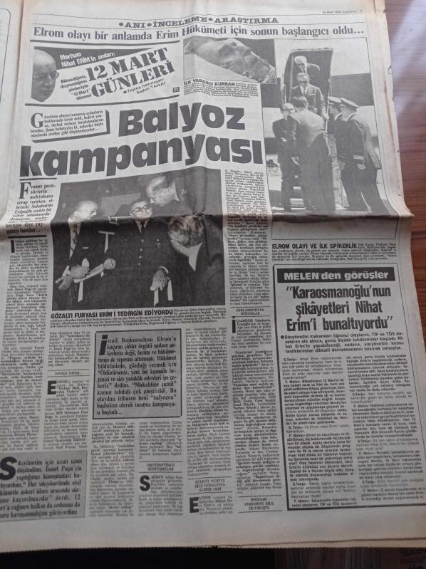 Hürriyet Gazetesi - 22 Mart 1986 - Merhum Nihat Erim'in Anıları 12 Mart Günleri Yazı Dizisi - Balyoz Operasyonu - Spor Toto Mahkemelik Oldu - Beşiktaş'ta Metin Tekin Sakatlandı - Odacılık Tarihe Karışıyor - Emel Sayın Korku İçinde - Korkut Özal'ın Süper Yükselişi - SHP'de İpin Ucu Koptu - Muzır Yasanın İlk Kurbanları - Turgut Özal Düşerse Ne Olur adlı eser Türkçe dilindedir.
