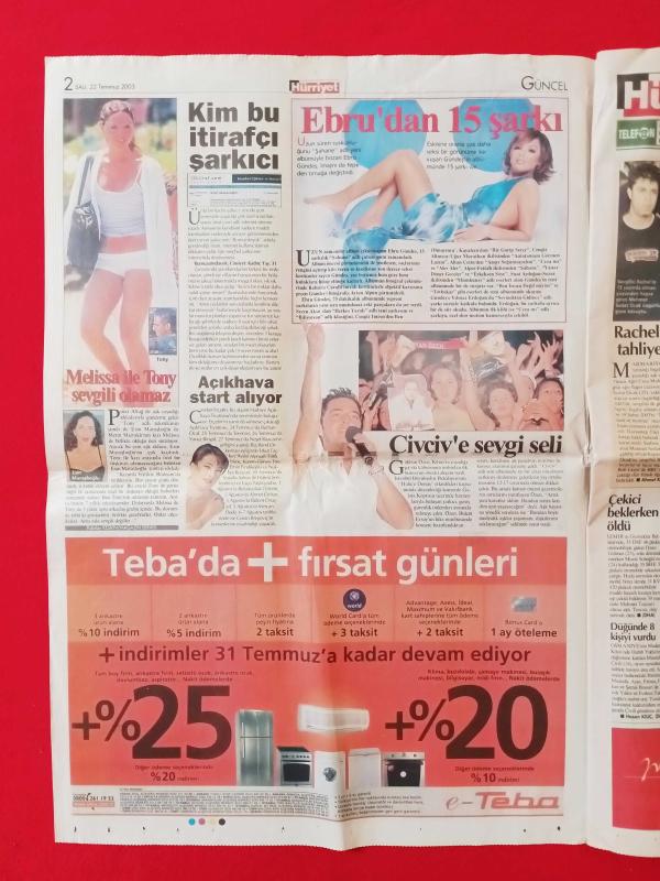 Hürriyet Gazetesi - 22 Temmuz 2003 - Galatasaray, Ebru Gündeş, Gökhan Özen, ... - Tam Gazete