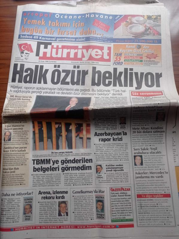 Hürriyet Gazetesi - 24 Ocak 1998 - Doping Yüzünden Teftişlik Olan Haltere Yeni Bir Bomba Düştü - Bill Clinton Oval Ofiste Harem Kurdu - Sezen Aksu - Özer Çiller İlk Kez Yargıç Önünde - Ömer Lütfü Topal'ı Timci'ler Öldürdü - Yeşil İle Telefon Görüşmeleri Sorulan Sırrı Sakık Yeşil Arabulucu Olacaktı - Susurluk Raporunda Suçlanan Aydın Ayaydın - Abdi İpekçi - Uğur Mumcu adlı eser, Kitap > Süreli Yayınlar > Gazeteler kategorisinde İkinci El olarak satıştadır.