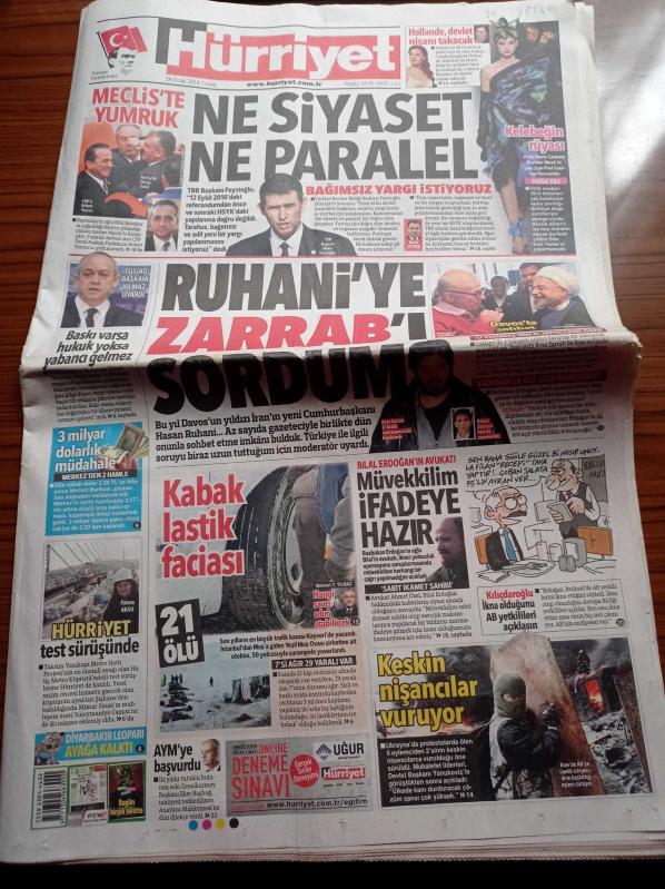 Hürriyet Gazetesi - 24 Ocak 2014 - Futbolda Şike Davası - Meclis'te Yumruk - Türkiye Barolar Birliği Başkanı Metin Feyzioğlu Bağımsız Yargı İstiyoruz - İran Cumhurbaşkanı Hasan Ruhani'ye Reza Zarrab'ı Sordum - Bilal Erdoğan'ın Avukatı Müvekkilim İfadeye Hazır - Ukrayna'da Avrupa Birliği'ne Üyelik İsteyenlerin Eylemi Sürüyor - TÜSİAD Başkanı Muharrem Yılmaz Uyardı adlı eser Türkçe dilindedir.