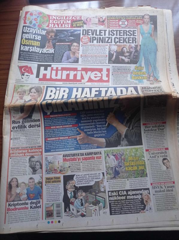 Hürriyet Gazetesi - 27 Eylül 2010 - Galatasaray Klasiği - Milan Baros - Mahsun Kırmızıgül'ün New York'ta Beş Minare Filmi - Kemal Kılıçdaroğlu Yeni Anayasayı Bir Haftada Çıkarırız - Recep Tayyip Erdoğan - Asil Nadir Devlet İsterse İpinizi Çeker - Uzaylılar Gelirse Osman Karşılayacak adlı eser Türkçe dilindedir.