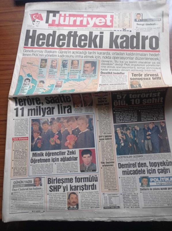 Hürriyet Gazetesi - 28 Ekim 1993 - A Millî Takım Polonyayı 22 Yıl Sonra Yendi - Fatih Terim - Şenes Erzik - Seksin Altın Kuralları - PKK'nın Hedefteki Kadrosu - Abdullah Öcalan - Doktor Baran - Kani Yılmaz - Cemil Bayık - Osman Öcalan - Teröre Saatte 11 Milyar Lira - PKK'lılar Kültür Bakanı Fikri Sağlar'ın Yolunu Kesti - Yüksek Seçim Kurulu Seçimler Ertelenmez - Rahmi Koç - Yalım Erez adlı eser Türkçe dilindedir.