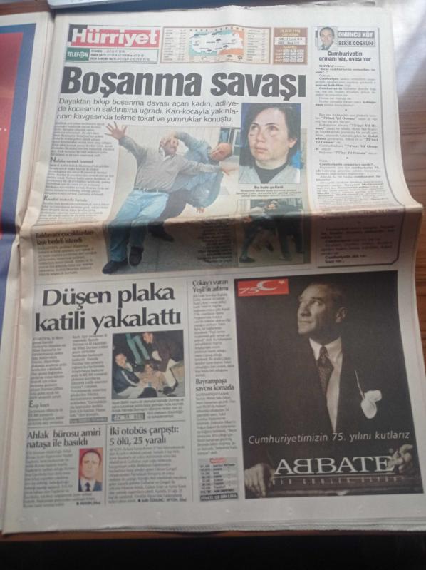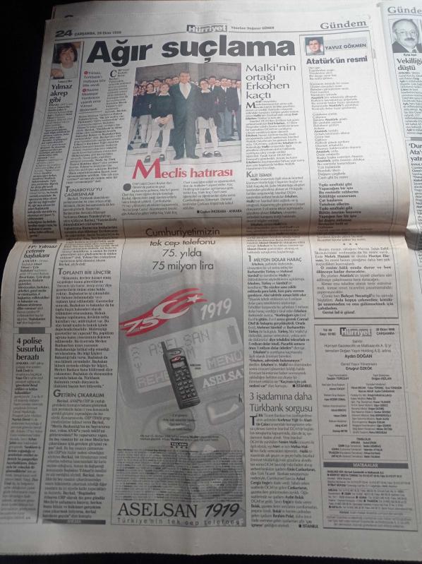 Hürriyet Gazetesi - 28 Ekim 1998 - Nesim Malki'de Yüz Kılçık - Erol Erkohen Karapara Trafiğini Aydınlattı Ve Kaçtı - Müthiş Yüzleşme Başbakanlık Konutunda Gerçekleşti - Türkbank İhalesi - Korkmaz Yiğit'i Yakan Konuşma - Manken Gelin Begüm Özbek Çiller'lerin Yalıya Taşındı - Mehmet Ağar'ın Kayıp Silah İtirafı - Levent Kırca'nın RTÜK Savaşı - Beyzbolda Yüzyılın Transferi Tutucu Mike Piazza - Tanju Çolak - Rıdvan Dilmen - Türkiye Kupası adlı eser Türkçe dilindedir.