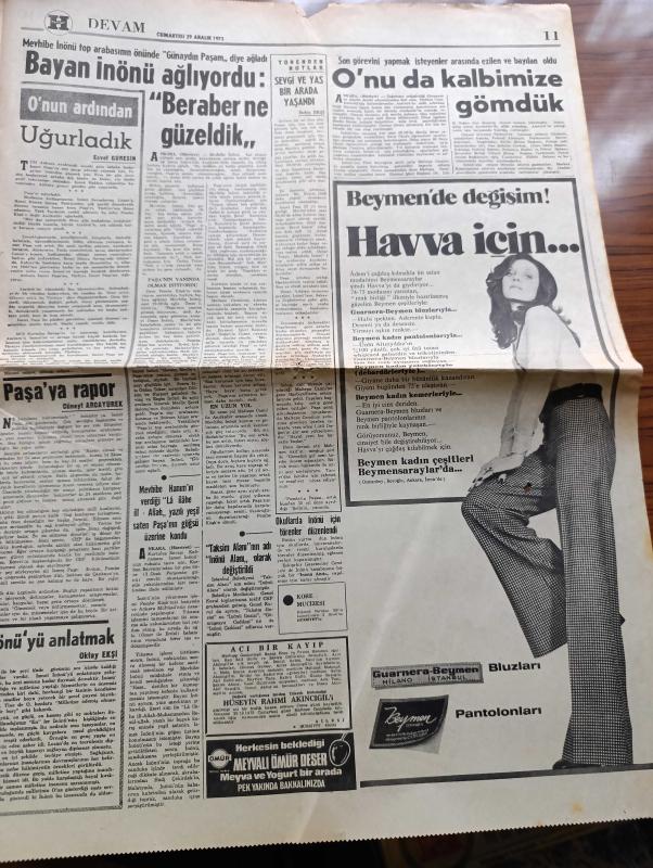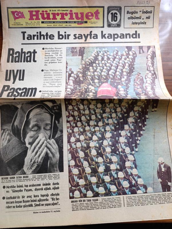 Hürriyet Gazetesi - 29 Aralık 1973 - Tarihte Bir Sayfa Daha Kapandı İsmet İnönü Hayata Veda Etti - Mevhibe İnönü Fatiha Okudu - Paşa Maltepe Camiinin Avlusuna Girerken İçeriden Cemaatle Vaaz Eden Lütfi Doğan'ın Sesi Yükseliyor Hayat Yeni Bir Hayatla Başlar - İsmet İnönü'nün Na'şını Yaşıyan Top Arabasını Harbiyeliler Çekerek Anıtkabir'e Götürdü - Mevhibe İnönü Top Arabasının Önünde Durdu Ve Günaydın Paşam Diyerek Ağladı - Ankara Dün Bir Tarih Yaşadı Fotoğraf- Doğudan Gelen Mektup - Bayan İnönü Ağlıyordu Beraberinde Ne Güzeldik - İsmet İnönü'nün Cenaze Töreni de Notlar Yazan Behiç Aşçı - Mevhibe Hanım'ın Verdiği La İlahe İllallah Yazılı Yeşil Saten Paşa'nın Göğsü Üzerine Kondu - Taksim Alanının Adı İnönü Alanı Olarak Değiştirildi - İnönü'yü Anlatmak Yazan Oktay Ekşi - Mevlana Cüneyt Gökçer Ve Kerim Afşar - Mevlana Yazan Metin Sosyal Yöneten Atıf Yılmaz - Bizimkiler Çizgi Roman - Yılların Özlemi Yazan Ve Çizen Faruk Geç - Fatoş Çizgi Roman - Güngörmüşler Çizgi Roman - Burç Falınız, Sedat Simavi tarafından kaleme alınmıştır. Hürriyet Gazetesi - 29 Aralık 1973 - Tarihte Bir Sayfa Daha Kapandı İsmet İnönü Hayata Veda Etti - Mevhibe İnönü Fatiha Okudu - Paşa Maltepe Camiinin Avlusuna Girerken İçeriden Cemaatle Vaaz Eden Lütfi Doğan'ın Sesi Yükseliyor Hayat Yeni Bir Hayatla Başlar - İsmet İnönü'nün Na'şını Yaşıyan Top Arabasını Harbiyeliler Çekerek Anıtkabir'e Götürdü - Mevhibe İnönü Top Arabasının Önünde Durdu Ve Günaydın Paşam Diyerek Ağladı - Ankara Dün Bir Tarih Yaşadı Fotoğraf- Doğudan Gelen Mektup - Bayan İnönü Ağlıyordu Beraberinde Ne Güzeldik - İsmet İnönü'nün Cenaze Töreni de Notlar Yazan Behiç Aşçı - Mevhibe Hanım'ın Verdiği La İlahe İllallah Yazılı Yeşil Saten Paşa'nın Göğsü Üzerine Kondu - Taksim Alanının Adı İnönü Alanı Olarak Değiştirildi - İnönü'yü Anlatmak Yazan Oktay Ekşi - Mevlana Cüneyt Gökçer Ve Kerim Afşar - Mevlana Yazan Metin Sosyal Yöneten Atıf Yılmaz - Bizimkiler Çizgi Roman - Yılların Özlemi Yazan Ve Çizen Faruk Geç - Fatoş Çizgi Roman - Güngörmüşler Çizgi Roman - Burç Falınız adlı eser Türkçe dilindedir.
