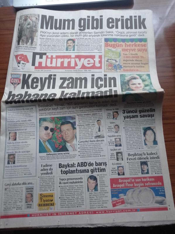 Hürriyet Gazetesi - 3 Aralık 1997 - Alpay Özalan Ve Tugay Kerimoğlu'na Haciz Şoku - Koç İle Metro Ortaklığı - Muammer Kaddafi - Fenerbahçe'nin Kupa Şovu - Türk İş - Hak İş - Aczmendi Lideri Müslüm Gündüz -Şemdin Sakık Mum Gibi Eridik - Pamela Anderson'un Seks Kaseti İnternette - Fadime Şahin İsmini Değiştirdi - Gülben Ergen - Deniz Baykal- Mesut Yılmaz adlı eser, Kitap > Süreli Yayınlar > Gazeteler kategorisinde İkinci El olarak satıştadır.