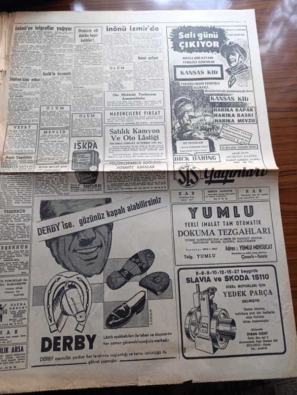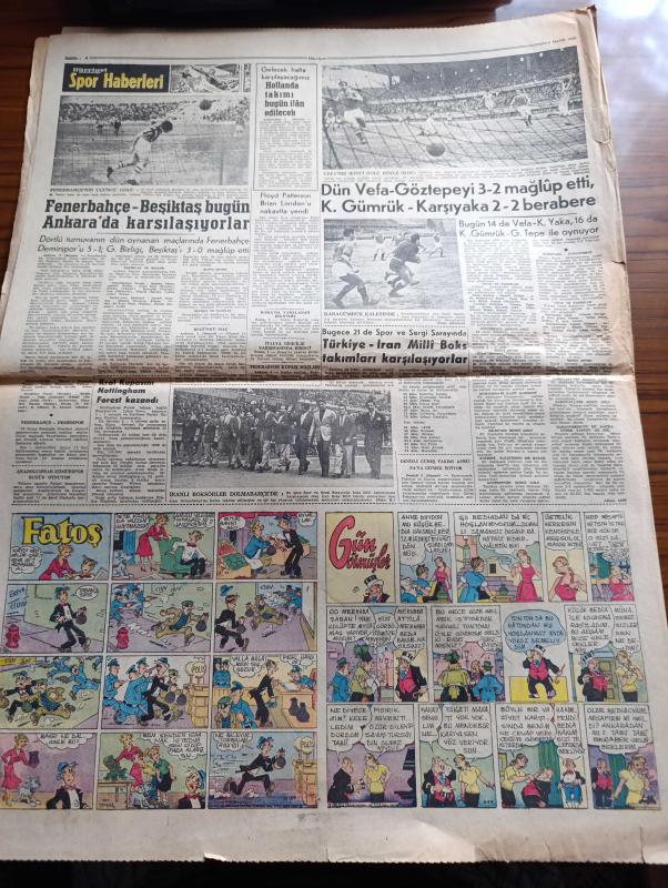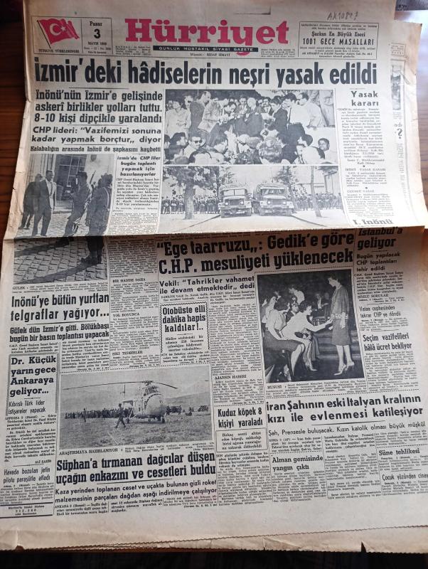 Hürriyet Gazetesi - 3 Mayıs 1959 - İzmir'deki hadiselerin neşri yasak edildi - İsmet İnönü'nün İzmir'e gelişinde askeri birlikler yolları tuttu 8 10 kişi dipçikle yaralandı - CHP lideri İsmet İnönü vazifemizi sonuna kadar yapmak borçtur dedi - Ege taarruzu dahiliye vekili Namık Gedik'e göre CHP mesuliyeti yüklenecek - İsmet İnönü'ye bütün yurttan telgraflar yağıyor - Kasım Gülek Dün İzmir'e gitti Osman Bölükbaşı bugün bir basın toplantısı yapacak - Kıbrıslı Türk lider Doktor Fazıl Küçük yarın gece Ankara'ya geliyor - sanat mektepleri mezunları cemiyeti defilesi fotoğraf - Hulusi Yeşilbaş Vatan cephesinden tekrar CHP'ye Döndü - Roma tatili prenses Margaret'e yeni bir sevgili getirdi fotoğraf - Hula Hoop zayıflatır mı hazırlayan Profesör Doktor Nuri Ergene - kalbimin aradığı erkek yazan Oya Baydar - Prenses Süreyya Nihayet aradığı saadeti bulmuş gibi fotoğraf - Fenerbahçe Beşiktaş bugün Ankara'da karşılaşıyorlar - Fotoğraf - Floyd Patterson Brian London'u nakavtla yendi - Vefa galip adlı eser, Kitap > Süreli Yayınlar > Gazeteler > Türkiye > Genel > Günlük kategorisinde İkinci El olarak satıştadır.