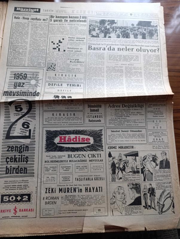 Hürriyet Gazetesi - 3 Mayıs 1959 - İzmir'deki hadiselerin neşri yasak edildi - İsmet İnönü'nün İzmir'e gelişinde askeri birlikler yolları tuttu 8 10 kişi dipçikle yaralandı - CHP lideri İsmet İnönü vazifemizi sonuna kadar yapmak borçtur dedi - Ege taarruzu dahiliye vekili Namık Gedik'e göre CHP mesuliyeti yüklenecek - İsmet İnönü'ye bütün yurttan telgraflar yağıyor - Kasım Gülek Dün İzmir'e gitti Osman Bölükbaşı bugün bir basın toplantısı yapacak - Kıbrıslı Türk lider Doktor Fazıl Küçük yarın gece Ankara'ya geliyor - sanat mektepleri mezunları cemiyeti defilesi fotoğraf - Hulusi Yeşilbaş Vatan cephesinden tekrar CHP'ye Döndü - Roma tatili prenses Margaret'e yeni bir sevgili getirdi fotoğraf - Hula Hoop zayıflatır mı hazırlayan Profesör Doktor Nuri Ergene - kalbimin aradığı erkek yazan Oya Baydar - Prenses Süreyya Nihayet aradığı saadeti bulmuş gibi fotoğraf - Fenerbahçe Beşiktaş bugün Ankara'da karşılaşıyorlar - Fotoğraf - Floyd Patterson Brian London'u nakavtla yendi - Vefa galip, Sedat Simavi tarafından kaleme alınmıştır. Hürriyet Gazetesi - 3 Mayıs 1959 - İzmir'deki hadiselerin neşri yasak edildi - İsmet İnönü'nün İzmir'e gelişinde askeri birlikler yolları tuttu 8 10 kişi dipçikle yaralandı - CHP lideri İsmet İnönü vazifemizi sonuna kadar yapmak borçtur dedi - Ege taarruzu dahiliye vekili Namık Gedik'e göre CHP mesuliyeti yüklenecek - İsmet İnönü'ye bütün yurttan telgraflar yağıyor - Kasım Gülek Dün İzmir'e gitti Osman Bölükbaşı bugün bir basın toplantısı yapacak - Kıbrıslı Türk lider Doktor Fazıl Küçük yarın gece Ankara'ya geliyor - sanat mektepleri mezunları cemiyeti defilesi fotoğraf - Hulusi Yeşilbaş Vatan cephesinden tekrar CHP'ye Döndü - Roma tatili prenses Margaret'e yeni bir sevgili getirdi fotoğraf - Hula Hoop zayıflatır mı hazırlayan Profesör Doktor Nuri Ergene - kalbimin aradığı erkek yazan Oya Baydar - Prenses Süreyya Nihayet aradığı saadeti bulmuş gibi fotoğraf - Fenerbahçe Beşiktaş bugün Ankara'da karşılaşıyorlar - Fotoğraf - Floyd Patterson Brian London'u nakavtla yendi - Vefa galip adlı eser Türkçe dilindedir.
