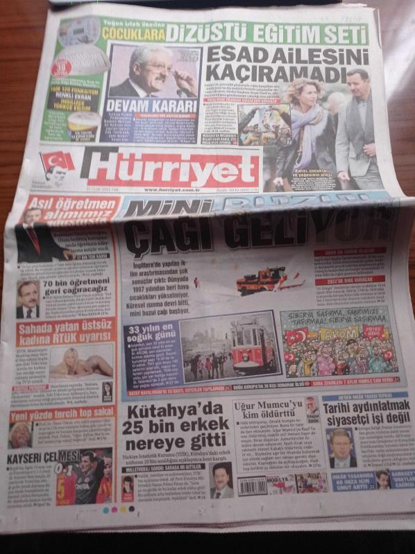 Hürriyet Gazetesi - 31 Ocak 2012 - Beşiktaş'a Serbest Galatasaray'a Yasak - Marilyn Monroe Twiti Yaktı - Sahada Yatan Üstsüz Kadına RTÜK Uyarısı - Yüz Nakli Yapılan Uğur Acar'ın Yeni Yüzde Tercihi Top Sakal- Beşar Esad Ailesini Kaçıramadı- Başbakan Recep Tayyip Erdoğan Ulusa Seslendi - Mini Buzul Çağı Geliyor - Türkiye Futbol Federasyonu Başkanı Mehmet Ali Aydınlar İstifa Yok Yola Devam adlı eser, Kitap > Süreli Yayınlar > Gazeteler kategorisinde İkinci El olarak satıştadır.