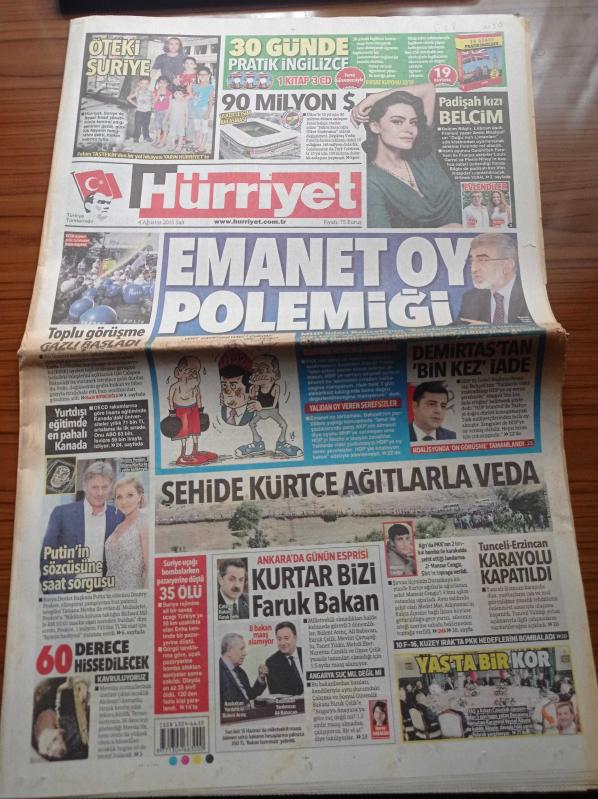 Hürriyet Gazetesi - 4 Ağustos 2015 - Fenerbahçe Şükrü Saraçoğlu Stadı İçin Ülker'le 90 Milyon Dolarlık Anlaşma - Felipe Melo - Öteki Suriye - Padişah Kızı Belçim Bilgin - Emanetçi Oy Polemiği - Selahattin Demirtaş Bin Kez İade - Bülent Arınç - Ali Babacan - Yüksek Askeri Şura adlı eser Türkçe dilindedir.