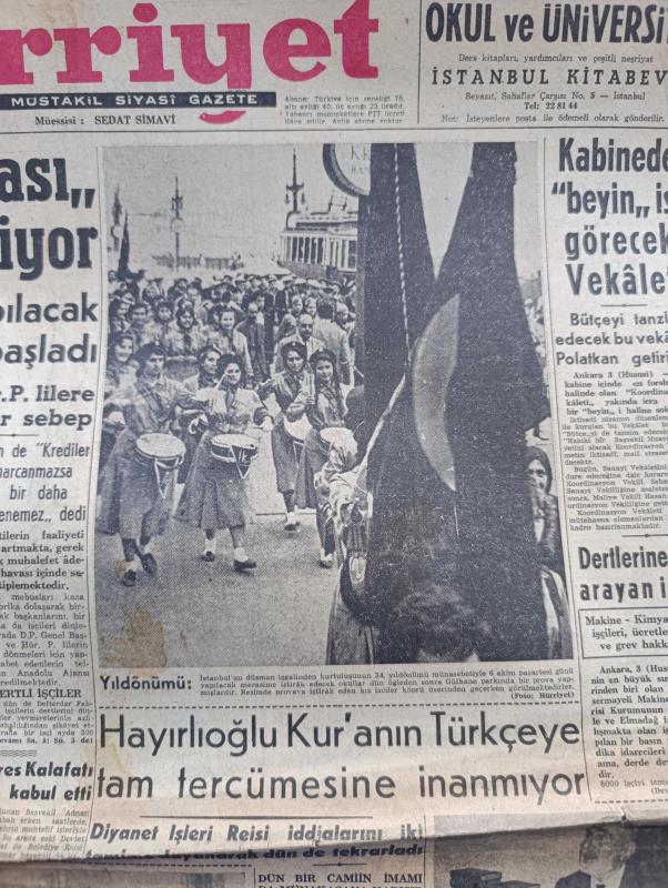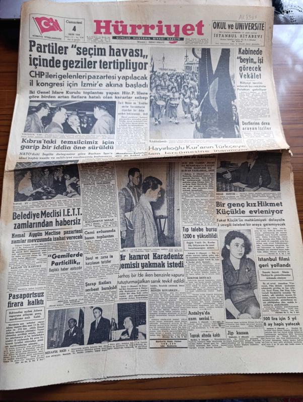 Hürriyet Gazetesi - 4 Ekim 1958 - Partilerin Seçim Havası İçinde Geziler Tertipliyor - İstanbul'un Düşman İşgalinden Kurtuluşunun 34. Yıldönümü Kutlandı Fotoğraf - Kıbrıs'ta mi Temsilcimiz İçin Garip Bir İddia Öne Sürüldü - Belediye Meclisi İETT Zamlarından Habersiz - Diyanet İşleri Başkanı Eyüp Sabri Hayırlıoğlu Kur'an'ın Türkçe'ye Tam Tercümesini İnanmıyor - Şarap Fiyatları Serbest Bırakıldı - İstanbul'da Sinema Tiyatro Programı - Kutbun Altından Nasıl Geçtik Yazan Kaptan Anderson - Türk Casusu İngiliz Kemal Kıbrıs Muammasının Peşinde Yazan İngiliz Kemal - Kıvılcım Ve Ateş Yazan Muazzez Tahsin Berkant Yazı Dizisi - Vefa Beykoz Bugün 15.15 De Karşılaşıyor - Karagümrük Dünkü Lig Maçında Kasımpaşayı 2 0 Yendi Fotoğraf - Beşiktaş Son İdmanını Dün Yaptı Fenerbahçe'de Bugün Çalışacak - Futbol Federasyonu Reisi Orhan Şeref Apak Bugün Bir Toplantı Yapacak, Yunus Nadi tarafından kaleme alınmıştır. Hürriyet Gazetesi - 4 Ekim 1958 - Partilerin Seçim Havası İçinde Geziler Tertipliyor - İstanbul'un Düşman İşgalinden Kurtuluşunun 34. Yıldönümü Kutlandı Fotoğraf - Kıbrıs'ta mi Temsilcimiz İçin Garip Bir İddia Öne Sürüldü - Belediye Meclisi İETT Zamlarından Habersiz - Diyanet İşleri Başkanı Eyüp Sabri Hayırlıoğlu Kur'an'ın Türkçe'ye Tam Tercümesini İnanmıyor - Şarap Fiyatları Serbest Bırakıldı - İstanbul'da Sinema Tiyatro Programı - Kutbun Altından Nasıl Geçtik Yazan Kaptan Anderson - Türk Casusu İngiliz Kemal Kıbrıs Muammasının Peşinde Yazan İngiliz Kemal - Kıvılcım Ve Ateş Yazan Muazzez Tahsin Berkant Yazı Dizisi - Vefa Beykoz Bugün 15.15 De Karşılaşıyor - Karagümrük Dünkü Lig Maçında Kasımpaşayı 2 0 Yendi Fotoğraf - Beşiktaş Son İdmanını Dün Yaptı Fenerbahçe'de Bugün Çalışacak - Futbol Federasyonu Reisi Orhan Şeref Apak Bugün Bir Toplantı Yapacak adlı eser Türkçe dilindedir.
