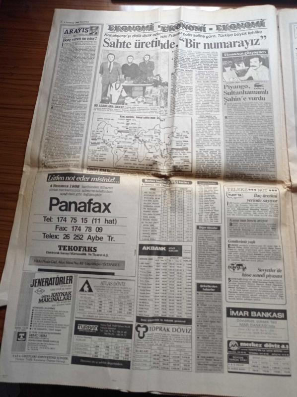 Hürriyet Gazetesi - 4 Temmuz 1988 - Binicilikte Ali Ersin Şampiyon - Fenerbahçe'den Toni Schumacher'e Lüküs Hayat - Boğaz'a 2. Gurur Fatih Sultan Mehmet Köprüsü Şov'la Açıldı - İkinci Kez İki Kıta Birbirine Bağlandı - Başbakan Turgut Özal Köprüden Geçerken Kurban Kesildi - Savcı Nusret Demiral Turgut Özal Suikastında Kartal Demirağ Yalnız Değil - Cumhurbaşkanı Kenan Evren Köprüyü Havadan Gördü - Rauf Denktaş Kıbrıs'ı Konuşmak İçin Geliyor adlı eser, Kitap > Süreli Yayınlar > Gazeteler kategorisinde İkinci El olarak satıştadır.