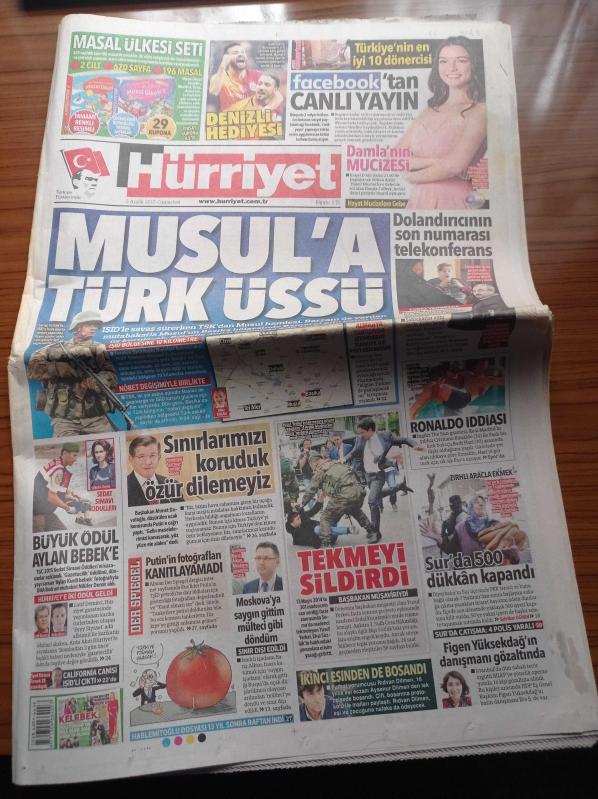 Hürriyet Gazetesi - 5 Aralık 2015 - Facebook'ta Canlı Yayın - Soma'da Madenci Tekmeleyen Yusuf Yerkel Hakkında Ekşi Sözlük Yorumlarını Sildirdi - Büyük Ödül Aylan Bebek'e - Diyarbakır Sur'da 500 Dükkan Kapandı - Musul'da Türk Üssü adlı eser Türkçe dilindedir.