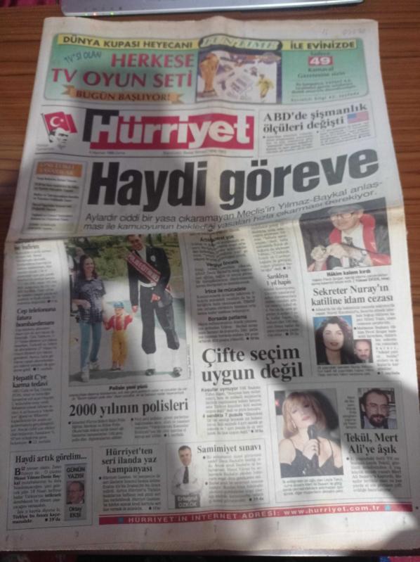 Hürriyet Gazetesi - 5 Haziran 1998 - Erzincan Valisi Recep Yazıcıoğlu Siyah Ekmek Viagra Gibi - Haluk Levent - Kayahan - Yeşim Salkım - NBA Kasırgası - Mesut Yılmaz İle Deniz Baykal Anlaştı - Çifte Seçim Uygun Değil - 2000 Yılının Polisleri - Fes Ya Sarık Giyenler 6 Aydan 1 Yıla Kadar Hapis Cezasına Çarptırılacaklar- Terörle Mücadele Tasarısı - Sekreter Nuray Karabulut'un Katiline İdam Cezası adlı eser, Kitap > Süreli Yayınlar > Gazeteler kategorisinde İkinci El olarak satıştadır.