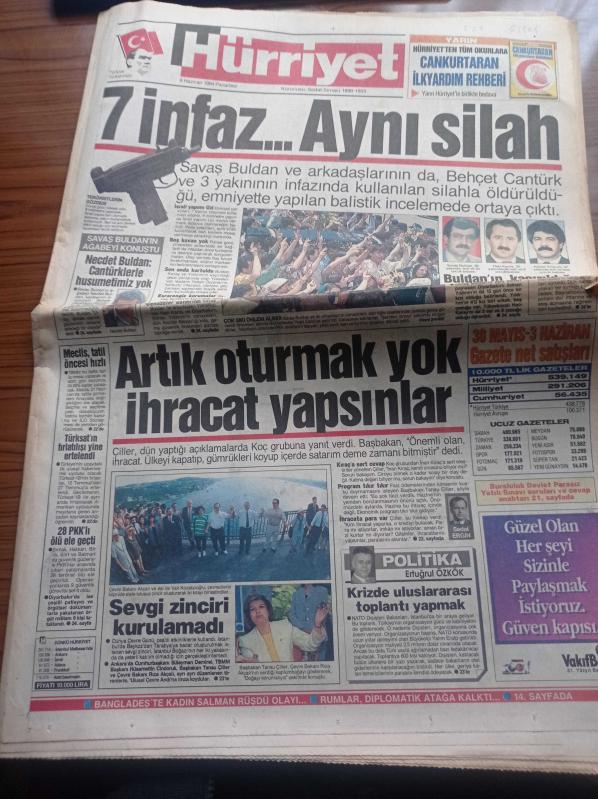 Hürriyet Gazetesi - 6 Haziran 1994 - Üç Büyük Kulübün Kurmayları Transfer Tartıştı - Hasan Özaydın - Alp Yalman - Serdar Bilgili - Rolland Garros'ta İspanyol Zaferi - Nixon'ı Yıkan Adam Bob Woodward Bill Clinton'a Taktı - Kadir İnanır - 7 İnfaz Aynı Silah - Savaş Buldan Behçet Cantürk'ün İnfazında Kullanılan Silahla Öldürüldüğü Ortaya Çıktı - Savaş Buldan'ın Cenazesinde Sıkı Önlem - Savaş Buldan'ın Abisi Necdet Buldan Cantürklerle Husumetimiz Yok- Tansu Çiller - Türksat'ın Fırlatılışı Yine Ertelendi adlı eser Türkçe dilindedir.