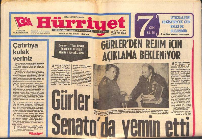 Hürriyet Gazetesi 8 Mart 1973 - Gürler Senato'da Yemin Etti - Fatma Girik Eşyasını Teker Teker Saydı GZ147001, en son 18 gün önce güncellenmiştir.