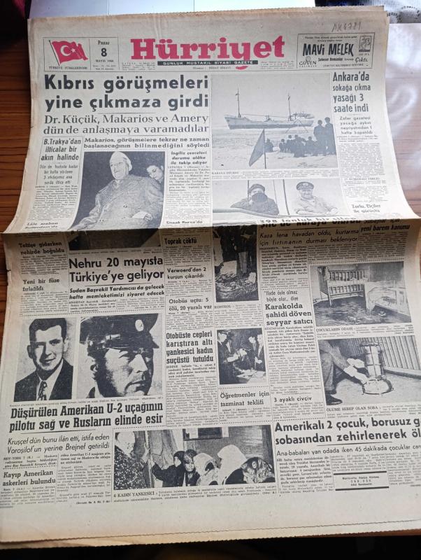 Hürriyet Gazetesi - 8 Mayıs 1960 - Kıbrıs Görüşmeleri Yine Çıkmaza Girdi - Batı Trakya'dan İlticalar Bir Akın Halinde - Lale Arabası Rotterdam'da - Nehru 20 Mayıs'ta Türkiye'ye Geliyor - Ankara'da Sokağa Çıkma Yasağı 3 Saate İndi - Fatin Rüştü Zorlu Elçiler İle Görüştü - De Gaulle İngiliz Yıldızı Sabrina'yı Reddetti - 5 Manken Fransa'da -Düşürülen Amerikan U 2 Uçağının Pilotu Sağ Ve Rusların Elinde Esir - İsimsiz Kadın Aşk Ve His Romanı Yazan Theresa Drake Yazı Dizisi - Dedektif Nik'in Maceraları Çizgi Roman - Brigitte Bardot'nun Kocası Çok Kıskanç Çıktı - Kalp Aldanmaz Aşk Ve Macera Romanı Çizen Faruk Geç - Allah Çocukları Unuttu Yazan Oya Baydar Yazı Dizisi - Hürrem Sultan Yazan Feridun Fazıl Tülbentçi Yazı Dizisi - Fenerbahçe Bugün Bursa'da Akınspor İle Karşılaşıyor - Beşiktaş Adapazarı'nda Yıldırımspor'la Oynuyor - Wolverhampton Blackburn'u 3 0 Yenip Federasyon Kupasını Kazandı - Avrupa Halter Şampiyonasında Halter Milli Takımımız Elimine Oldu - Feriköy Avrupa Turnesine Çıkacak, Sedat Simavi tarafından kaleme alınmıştır. Hürriyet Gazetesi - 8 Mayıs 1960 - Kıbrıs Görüşmeleri Yine Çıkmaza Girdi - Batı Trakya'dan İlticalar Bir Akın Halinde - Lale Arabası Rotterdam'da - Nehru 20 Mayıs'ta Türkiye'ye Geliyor - Ankara'da Sokağa Çıkma Yasağı 3 Saate İndi - Fatin Rüştü Zorlu Elçiler İle Görüştü - De Gaulle İngiliz Yıldızı Sabrina'yı Reddetti - 5 Manken Fransa'da -Düşürülen Amerikan U 2 Uçağının Pilotu Sağ Ve Rusların Elinde Esir - İsimsiz Kadın Aşk Ve His Romanı Yazan Theresa Drake Yazı Dizisi - Dedektif Nik'in Maceraları Çizgi Roman - Brigitte Bardot'nun Kocası Çok Kıskanç Çıktı - Kalp Aldanmaz Aşk Ve Macera Romanı Çizen Faruk Geç - Allah Çocukları Unuttu Yazan Oya Baydar Yazı Dizisi - Hürrem Sultan Yazan Feridun Fazıl Tülbentçi Yazı Dizisi - Fenerbahçe Bugün Bursa'da Akınspor İle Karşılaşıyor - Beşiktaş Adapazarı'nda Yıldırımspor'la Oynuyor - Wolverhampton Blackburn'u 3 0 Yenip Federasyon Kupasını Kazandı - Avrupa Halter Şampiyonasında Halter Milli Takımımız Elimine Oldu - Feriköy Avrupa Turnesine Çıkacak adlı eser Türkçe dilindedir.