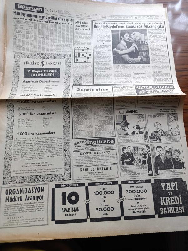 Hürriyet Gazetesi - 8 Mayıs 1960 - Kıbrıs Görüşmeleri Yine Çıkmaza Girdi - Batı Trakya'dan İlticalar Bir Akın Halinde - Lale Arabası Rotterdam'da - Nehru 20 Mayıs'ta Türkiye'ye Geliyor - Ankara'da Sokağa Çıkma Yasağı 3 Saate İndi - Fatin Rüştü Zorlu Elçiler İle Görüştü - De Gaulle İngiliz Yıldızı Sabrina'yı Reddetti - 5 Manken Fransa'da -Düşürülen Amerikan U 2 Uçağının Pilotu Sağ Ve Rusların Elinde Esir - İsimsiz Kadın Aşk Ve His Romanı Yazan Theresa Drake Yazı Dizisi - Dedektif Nik'in Maceraları Çizgi Roman - Brigitte Bardot'nun Kocası Çok Kıskanç Çıktı - Kalp Aldanmaz Aşk Ve Macera Romanı Çizen Faruk Geç - Allah Çocukları Unuttu Yazan Oya Baydar Yazı Dizisi - Hürrem Sultan Yazan Feridun Fazıl Tülbentçi Yazı Dizisi - Fenerbahçe Bugün Bursa'da Akınspor İle Karşılaşıyor - Beşiktaş Adapazarı'nda Yıldırımspor'la Oynuyor - Wolverhampton Blackburn'u 3 0 Yenip Federasyon Kupasını Kazandı - Avrupa Halter Şampiyonasında Halter Milli Takımımız Elimine Oldu - Feriköy Avrupa Turnesine Çıkacak adlı eser, Kitap > Süreli Yayınlar > Gazeteler > Türkiye > Genel > Günlük kategorisinde İkinci El olarak satıştadır.