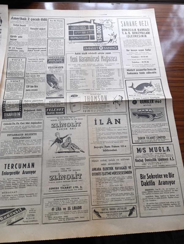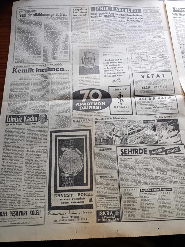 Hürriyet Gazetesi - 8 Mayıs 1960 - Kıbrıs Görüşmeleri Yine Çıkmaza Girdi - Batı Trakya'dan İlticalar Bir Akın Halinde - Lale Arabası Rotterdam'da - Nehru 20 Mayıs'ta Türkiye'ye Geliyor - Ankara'da Sokağa Çıkma Yasağı 3 Saate İndi - Fatin Rüştü Zorlu Elçiler İle Görüştü - Düşürülen Amerikan U 2 Uçağının Pilotu Sağ Ve Rusların Elinde Esir - İsimsiz Kadın Aşk Ve His Romanı Yazan Theresa Drake Yazı Dizisi - Dedektif Nik'in Maceraları Çizgi Roman - Brigitte Bardot'nun Kocası Çok Kıskanç Çıktı - Kalp Aldanmaz Aşk Ve Macera Romanı Çizen Faruk Geç - Allah Çocukları Unuttu Yazan Oya Baydar Yazı Dizisi - Hürrem Sultan Yazan Feridun Fazıl Tülbentçi Yazı Dizisi - Fenerbahçe Bugün Bursa'da Akınspor İle Karşılaşıyor - Beşiktaş Adapazarı'nda Yıldırımspor'la Oynuyor - Wolverhampton Blackburn'u 3 0 Yenip Federasyon Kupasını Kazandı - Avrupa Halter Şampiyonasında Halter Milli Takımımız Elimine Oldu - Fatoş Çizgi Roman - Güngörmüşler Çizgi Roman - Feriköy Avrupa Turnesine Çıkacak adlı eser, Kitap > Süreli Yayınlar > Gazeteler > Türkiye > Genel > Günlük kategorisinde İkinci El olarak satıştadır.