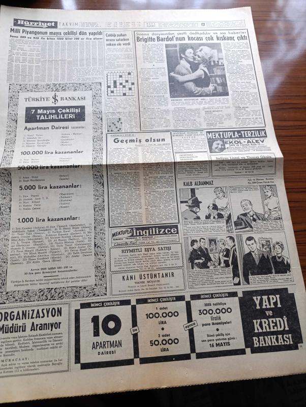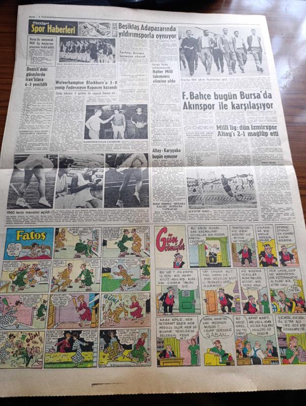 Hürriyet Gazetesi - 8 Mayıs 1960 - Kıbrıs Görüşmeleri Yine Çıkmaza Girdi - Batı Trakya'dan İlticalar Bir Akın Halinde - Lale Arabası Rotterdam'da - Nehru 20 Mayıs'ta Türkiye'ye Geliyor - Ankara'da Sokağa Çıkma Yasağı 3 Saate İndi - Fatin Rüştü Zorlu Elçiler İle Görüştü - Düşürülen Amerikan U 2 Uçağının Pilotu Sağ Ve Rusların Elinde Esir - İsimsiz Kadın Aşk Ve His Romanı Yazan Theresa Drake Yazı Dizisi - Dedektif Nik'in Maceraları Çizgi Roman - Brigitte Bardot'nun Kocası Çok Kıskanç Çıktı - Kalp Aldanmaz Aşk Ve Macera Romanı Çizen Faruk Geç - Allah Çocukları Unuttu Yazan Oya Baydar Yazı Dizisi - Hürrem Sultan Yazan Feridun Fazıl Tülbentçi Yazı Dizisi - Fenerbahçe Bugün Bursa'da Akınspor İle Karşılaşıyor - Beşiktaş Adapazarı'nda Yıldırımspor'la Oynuyor - Wolverhampton Blackburn'u 3 0 Yenip Federasyon Kupasını Kazandı - Avrupa Halter Şampiyonasında Halter Milli Takımımız Elimine Oldu - Fatoş Çizgi Roman - Güngörmüşler Çizgi Roman - Feriköy Avrupa Turnesine Çıkacak, Sedat Simavi tarafından kaleme alınmıştır. Hürriyet Gazetesi - 8 Mayıs 1960 - Kıbrıs Görüşmeleri Yine Çıkmaza Girdi - Batı Trakya'dan İlticalar Bir Akın Halinde - Lale Arabası Rotterdam'da - Nehru 20 Mayıs'ta Türkiye'ye Geliyor - Ankara'da Sokağa Çıkma Yasağı 3 Saate İndi - Fatin Rüştü Zorlu Elçiler İle Görüştü - Düşürülen Amerikan U 2 Uçağının Pilotu Sağ Ve Rusların Elinde Esir - İsimsiz Kadın Aşk Ve His Romanı Yazan Theresa Drake Yazı Dizisi - Dedektif Nik'in Maceraları Çizgi Roman - Brigitte Bardot'nun Kocası Çok Kıskanç Çıktı - Kalp Aldanmaz Aşk Ve Macera Romanı Çizen Faruk Geç - Allah Çocukları Unuttu Yazan Oya Baydar Yazı Dizisi - Hürrem Sultan Yazan Feridun Fazıl Tülbentçi Yazı Dizisi - Fenerbahçe Bugün Bursa'da Akınspor İle Karşılaşıyor - Beşiktaş Adapazarı'nda Yıldırımspor'la Oynuyor - Wolverhampton Blackburn'u 3 0 Yenip Federasyon Kupasını Kazandı - Avrupa Halter Şampiyonasında Halter Milli Takımımız Elimine Oldu - Fatoş Çizgi Roman - Güngörmüşler Çizgi Roman - Feriköy Avrupa Turnesine Çıkacak adlı eser Türkçe dilindedir.