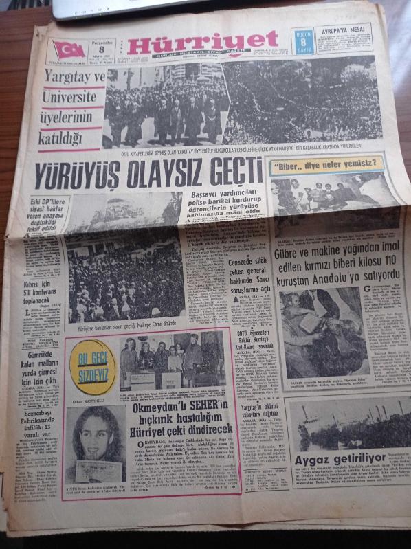 Hürriyet Gazetesi - 8 Mayıs 1969 - Asrın En Komik Yarışı - Yargıtay Ve Üniversite Üyelerinin Katıldığı Yürüyüş Olaysız Geçti - ODTÜ Öğrencileri Rektör Kemal Kurdaş'ı Anıtkabir'e Sokmadı - Yargıtay Başkanı İmran Öktem'in Cenazesinde Silah Çeken Tuğgeneral Nabi Alpartun Hakkında Soruşturma Açıldı - Aygaz Getiriliyor adlı eser Türkçe dilindedir.
