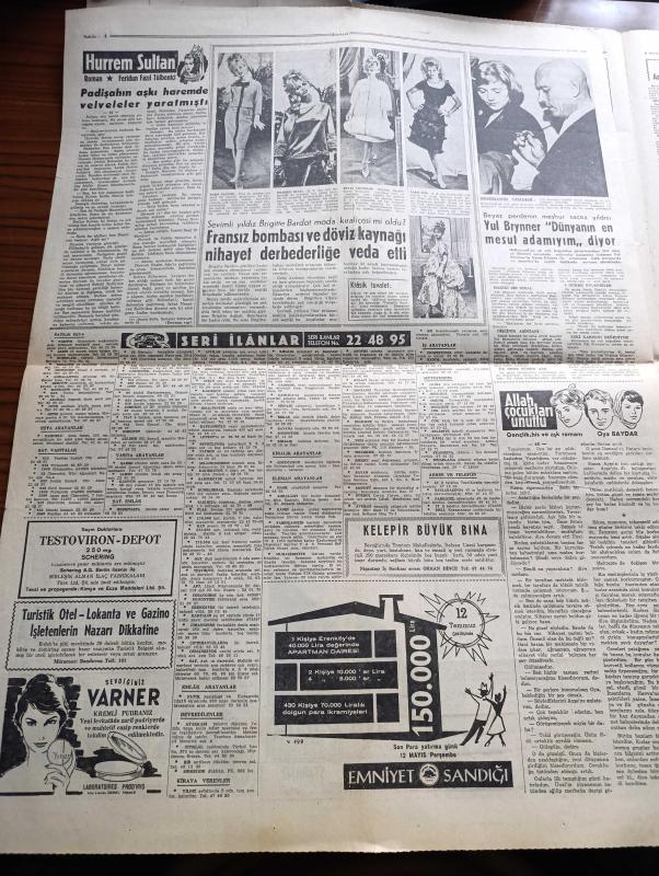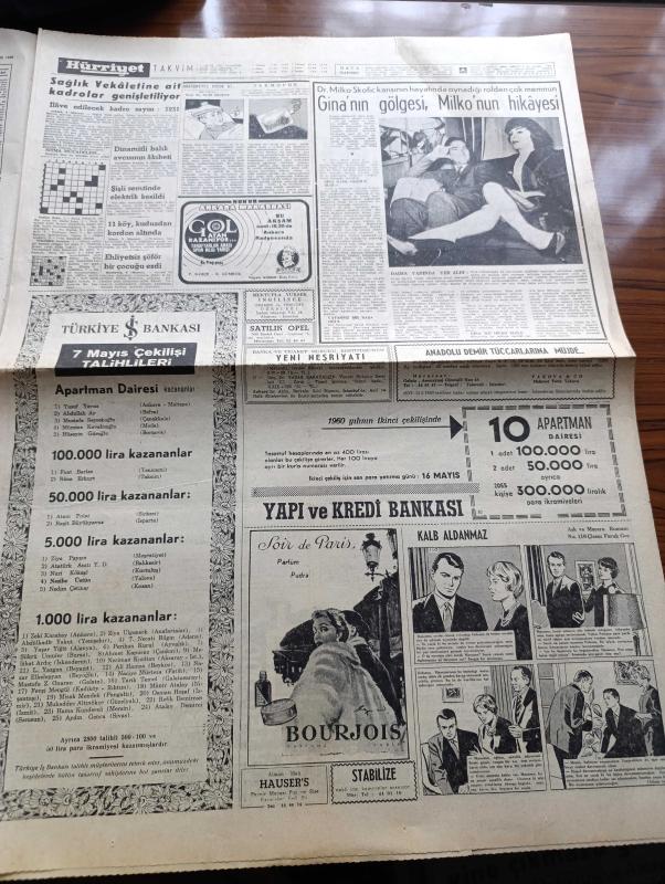 Hürriyet Gazetesi - 9 Mayıs 1960 - Rusya'da Düşürülen Amerikan Uçağı İçin Hariciye Bir Tebliğ Neşretti - İbadethaneler İle Sinema Ve Tiyatrolar Bugün Açılıyor - Sinema Ve Tiyatro Seansları 20 de Bitecek - NATO Genel Sekreteri Spaak Dün Gitti - Prenses Margaret'in Kocası Kontluk Unvanını Reddetti - Zenci Kız Festival Güzeli Seçildi - Veren Kongresi Sivas'ta Açılacak - İsimsiz Kadın Aşk Ve His Romanı Yazan Theresa Drake Yazı Dizisi - İngiltere Müşterek Pazara Mı Girecek - Dedektif Nik'in Maceraları Çizgi Roman - Gina Lolobrigida'nın Gölgesi Milko Skofic'in Hikayesi - Kalp Aldanmaz Aşk Ve Macera Romanı Çizen Faruk Geç - Sevimli Yıldız Brigitte Bardot Moda Kraliçesi Mi Oldu - Hürrem Sultan Yazan Feridun Fazıl Tülbentçi Yazı Dizisi - Beyaz Perdenin Meşhur Saçsız Yıldızı Yul Brynner Dünyanın En Mesut Adamıyım Diyor - Allah Çocukları Unuttu Yazan Oya Baydar - Fenerbahçe Bursa'daki Maçta Akınspor'u 5 1 Mağlup Etti - Ordu Futbol Takımımız Yarın Cezayire Gidiyor - Galatasaray İsviçre'de, Sedat Simavi tarafından kaleme alınmıştır. Hürriyet Gazetesi - 9 Mayıs 1960 - Rusya'da Düşürülen Amerikan Uçağı İçin Hariciye Bir Tebliğ Neşretti - İbadethaneler İle Sinema Ve Tiyatrolar Bugün Açılıyor - Sinema Ve Tiyatro Seansları 20 de Bitecek - NATO Genel Sekreteri Spaak Dün Gitti - Prenses Margaret'in Kocası Kontluk Unvanını Reddetti - Zenci Kız Festival Güzeli Seçildi - Veren Kongresi Sivas'ta Açılacak - İsimsiz Kadın Aşk Ve His Romanı Yazan Theresa Drake Yazı Dizisi - İngiltere Müşterek Pazara Mı Girecek - Dedektif Nik'in Maceraları Çizgi Roman - Gina Lolobrigida'nın Gölgesi Milko Skofic'in Hikayesi - Kalp Aldanmaz Aşk Ve Macera Romanı Çizen Faruk Geç - Sevimli Yıldız Brigitte Bardot Moda Kraliçesi Mi Oldu - Hürrem Sultan Yazan Feridun Fazıl Tülbentçi Yazı Dizisi - Beyaz Perdenin Meşhur Saçsız Yıldızı Yul Brynner Dünyanın En Mesut Adamıyım Diyor - Allah Çocukları Unuttu Yazan Oya Baydar - Fenerbahçe Bursa'daki Maçta Akınspor'u 5 1 Mağlup Etti - Ordu Futbol Takımımız Yarın Cezayire Gidiyor - Galatasaray İsviçre'de adlı eser Türkçe dilindedir.