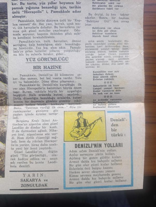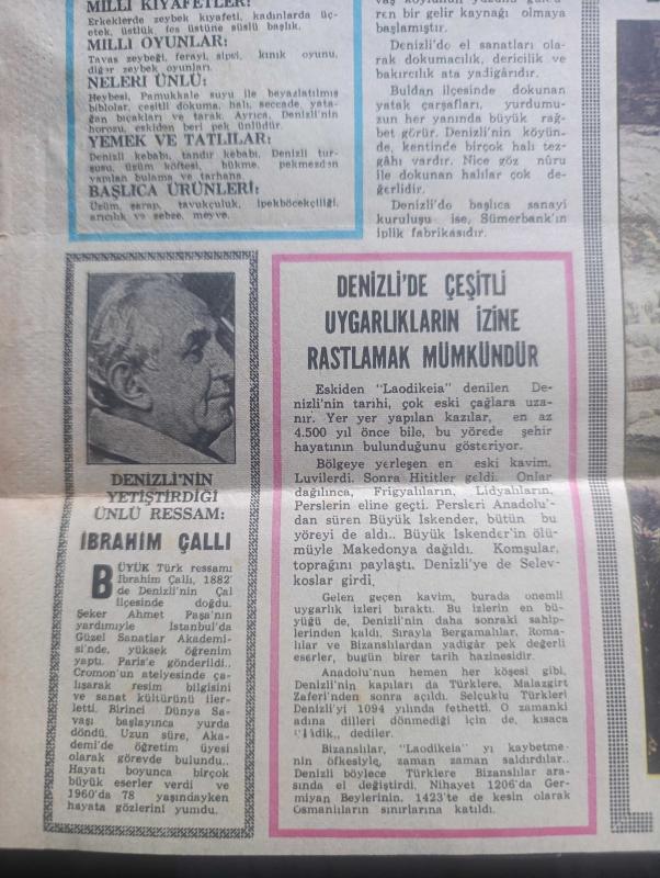Hürriyet Gazetesi Kupürü - Turkish Newspaper - 20 Haziran 1972 - İl'den İl'e Türkiye hazırlayan Metin Soysal - Denizli - Denizli'nin yetiştirdiği ünlü Ressam İbrahim Çallı Fotoğrafı - Denizli'nin topraklarından bolluk ve bereket saçılır - Aşk tanrıçası afrodit bile güzelliğini korumak için Denizli'nin kaplıca sularından getirmiştir - Denizli'de ataların dilinden sözler - Denizli'nin adı nereden gelir - Deniz gibi suyuna bakarak Denizli dediler Fotoğrafı - Pamukkale eşi bulunmayan bir tabiat harikasıdır - Pamukkale'yi kayalardan dökülen kireçli sular meydana getirmiştir Fotoğrafı - Denizli'de çeşitli uygarlıkların izine rastlamak mümkündür - Denizli'nin yolları türküsü - Horozu ile ünlü ilimiz Denizli'nin kimlik kartı - Denizli'de okur yazar oranı - Denizli'de turistik aylar - Denizli'nin milli oyunları - Denizli'nin milli kıyafetleri - Denizli'de yemek ve tatlılar - Denizli'nin neleri ünlü - Akbank resim ve fotoğraf yarışmaları - Atatürk'ün kur'an-ı Kerim'i - Milli piyango Dün çekildi